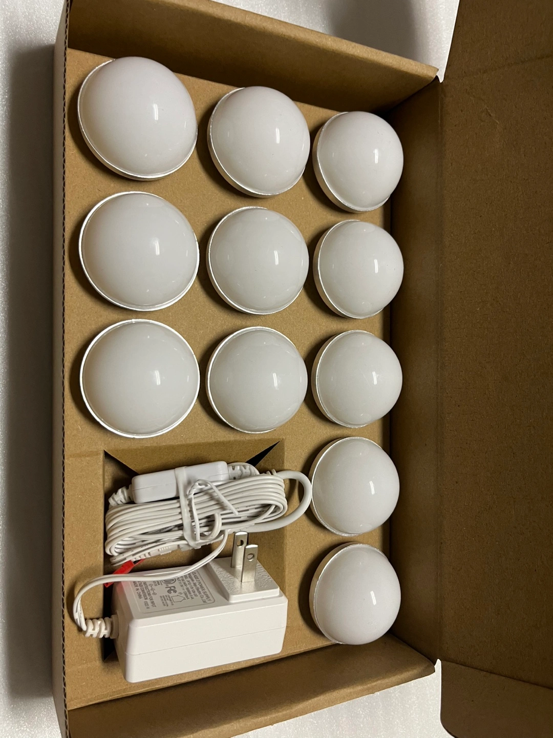 Vanity table set with lighted mirror, four drawers, and a stool. White finish.
