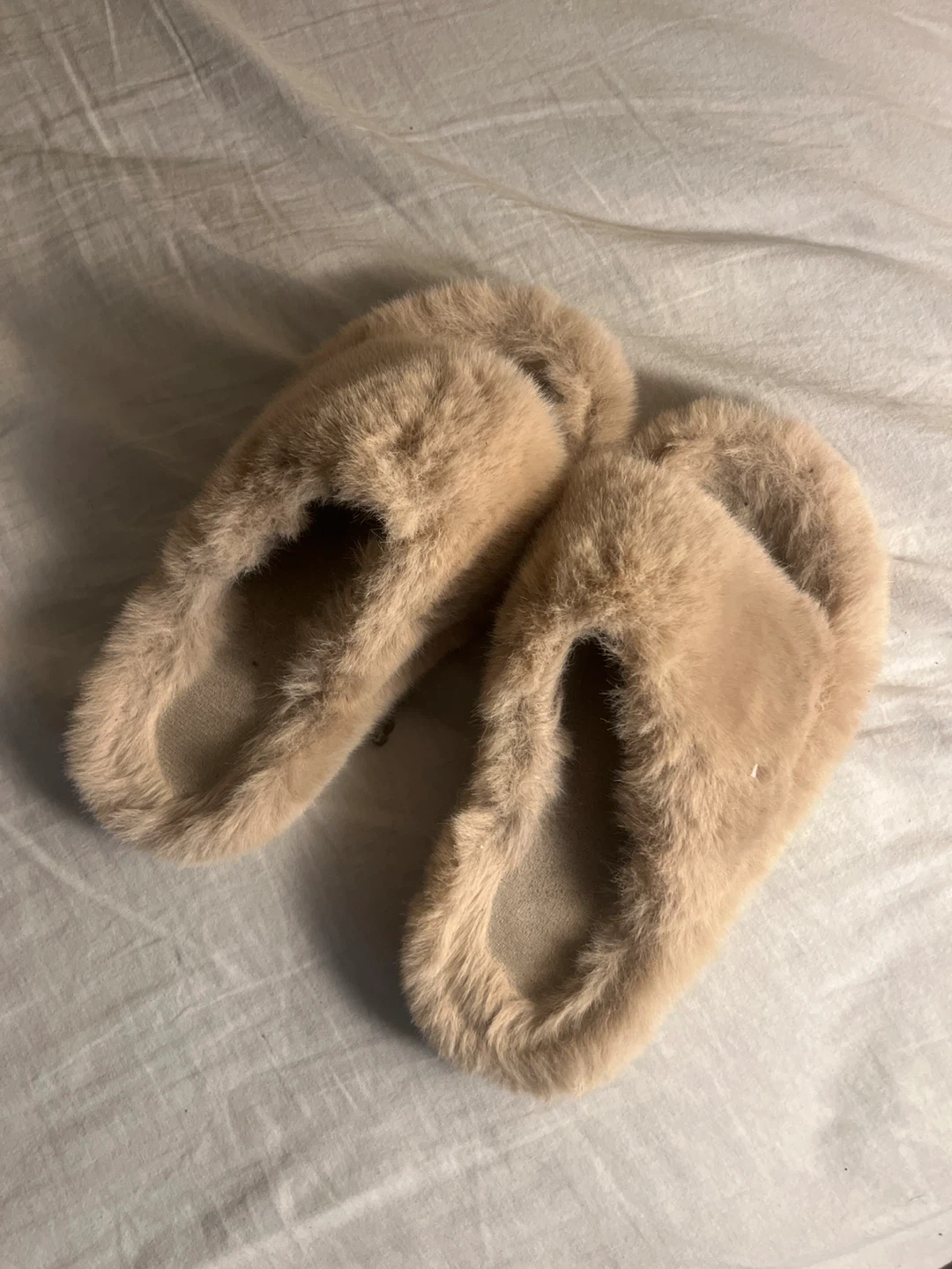 Comfy, fluffy slippers in a neutral beige colour. Plush faux fur on the outside with a soft lining inside. These slide-on slippers offer cozy warmth for your feet. Size is medium. No need anymore, I got new one. Pls message if interested.