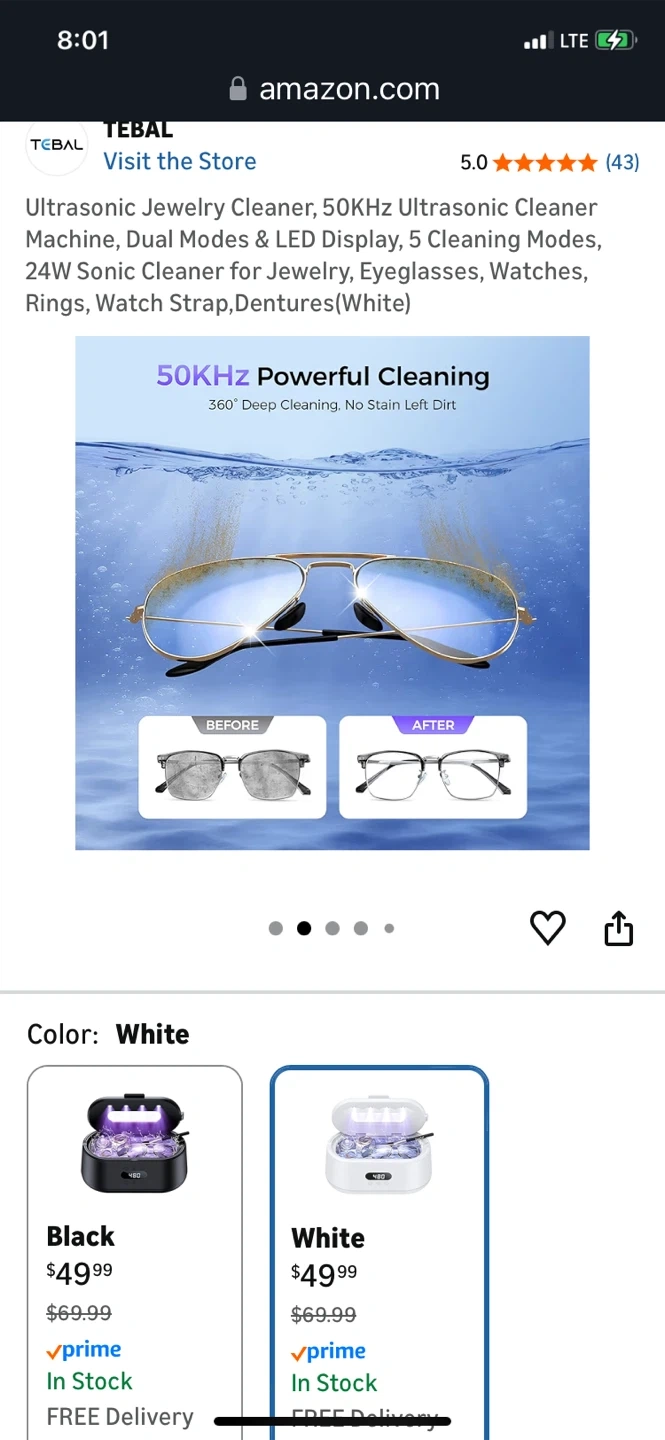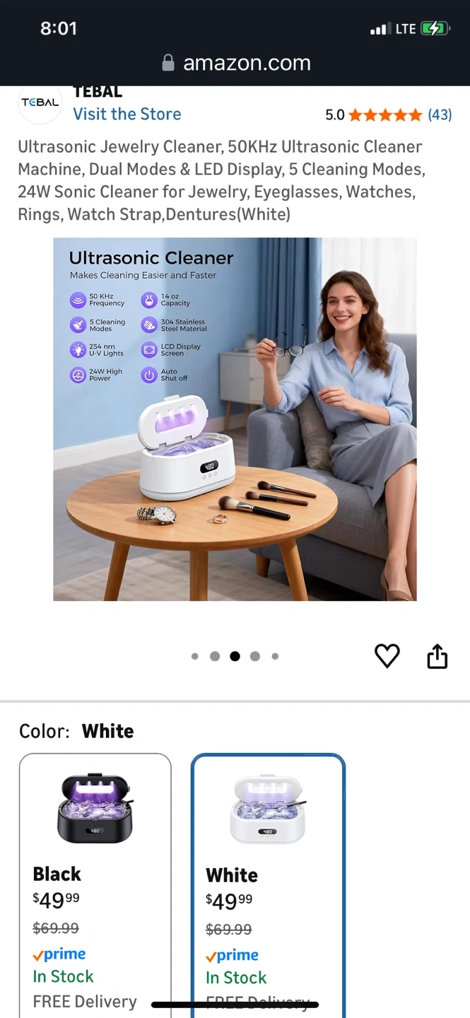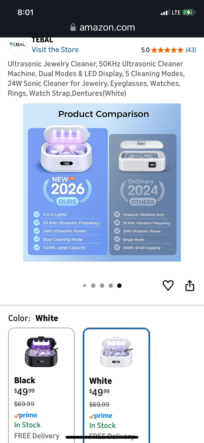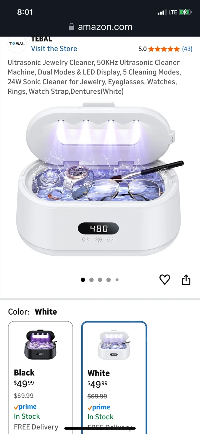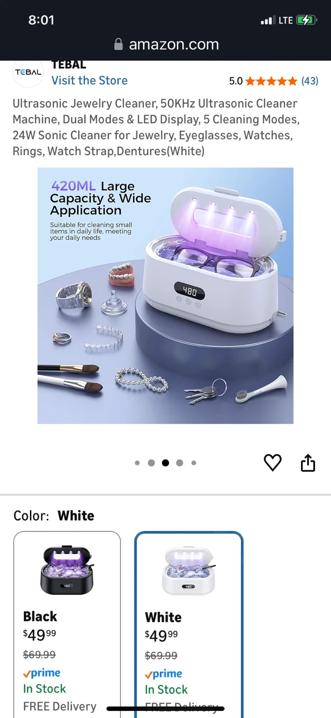 This is a TEBAL ultrasonic jewelry cleaner machine with dual modes and an LED display. It features 5 cleaning modes and 24W sonic power. The tank capacity is 420ml.