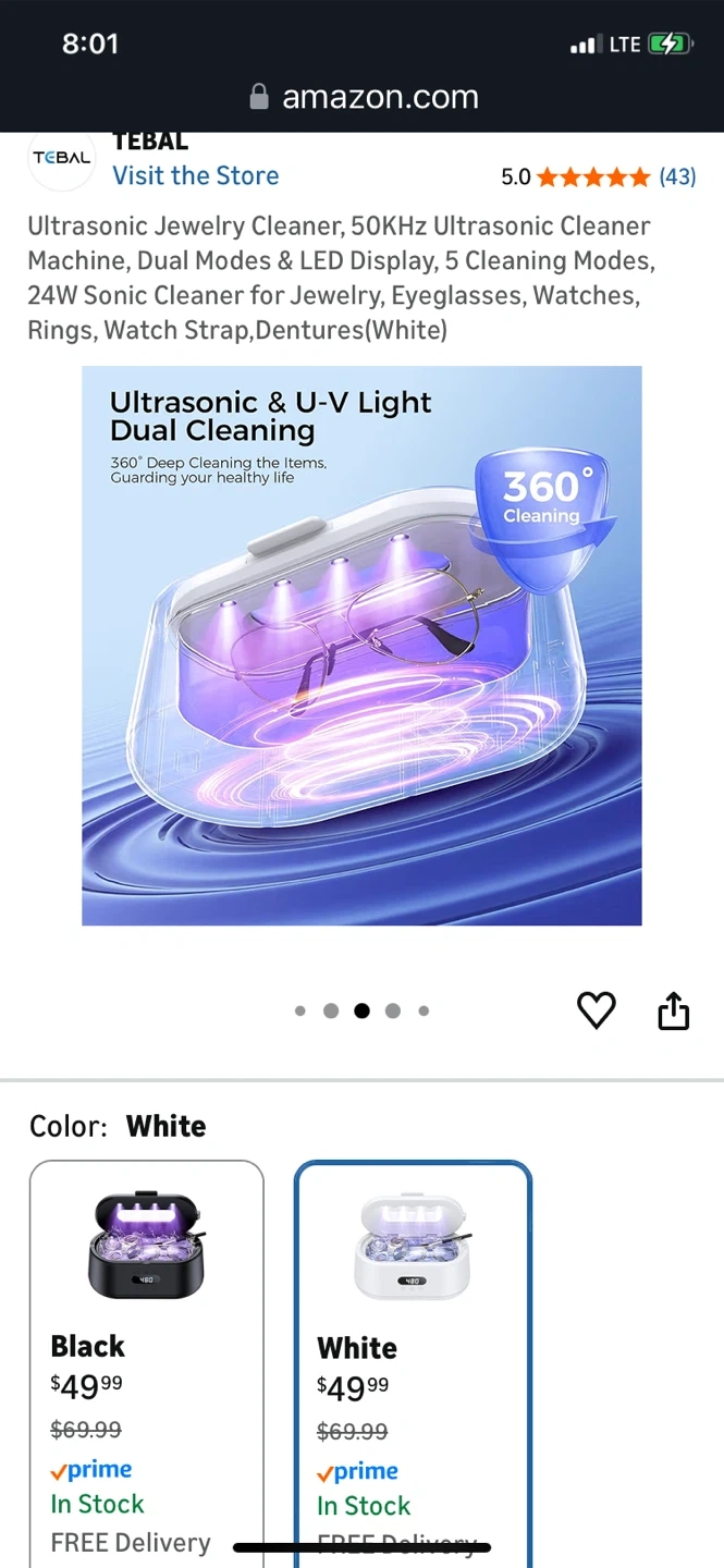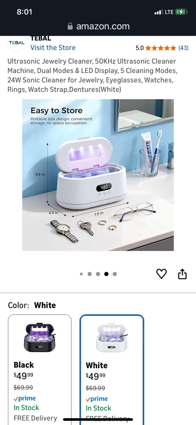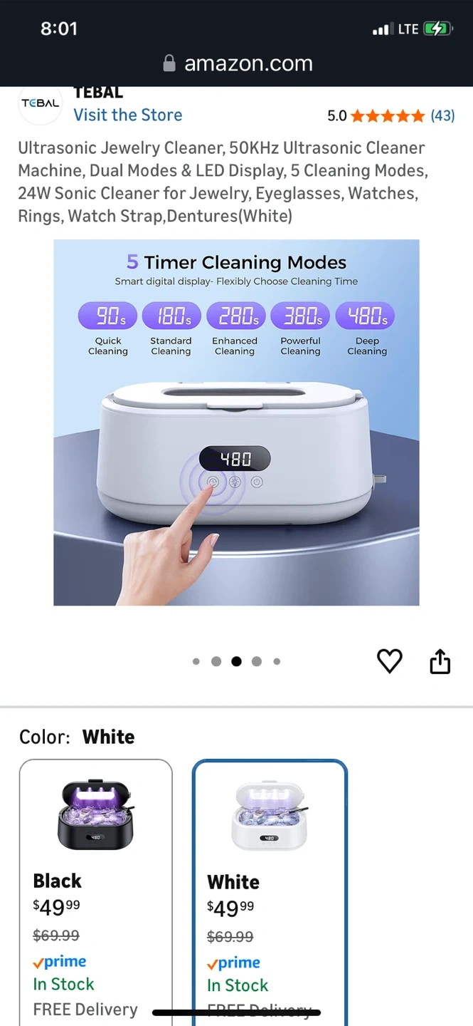 This is a TEBAL ultrasonic jewelry cleaner machine with dual modes and an LED display. It features 5 cleaning modes and 24W sonic power. The tank capacity is 420ml.