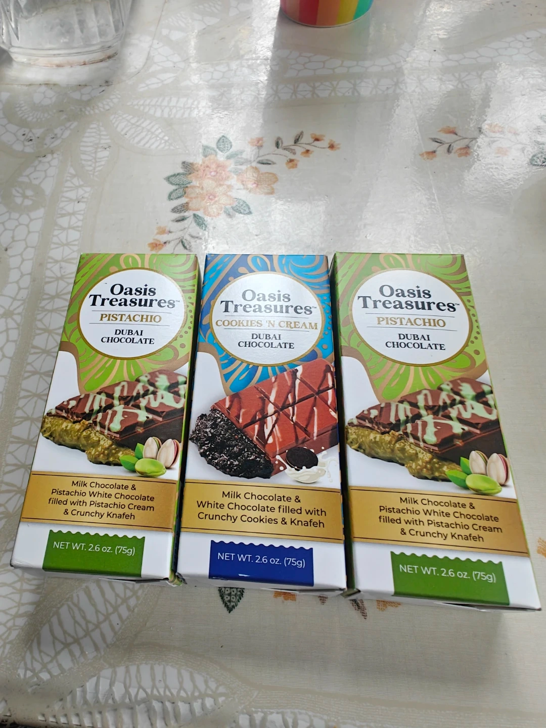 Three Oasis Treasures Dubai chocolate bars. Includes two Pistachio flavour and one Cookies 'n Cream flavour. Each bar is 75g. They're filled with milk and white chocolate with various fillings like pistachio cream and crunchy knafeh or cookies. $10 for all