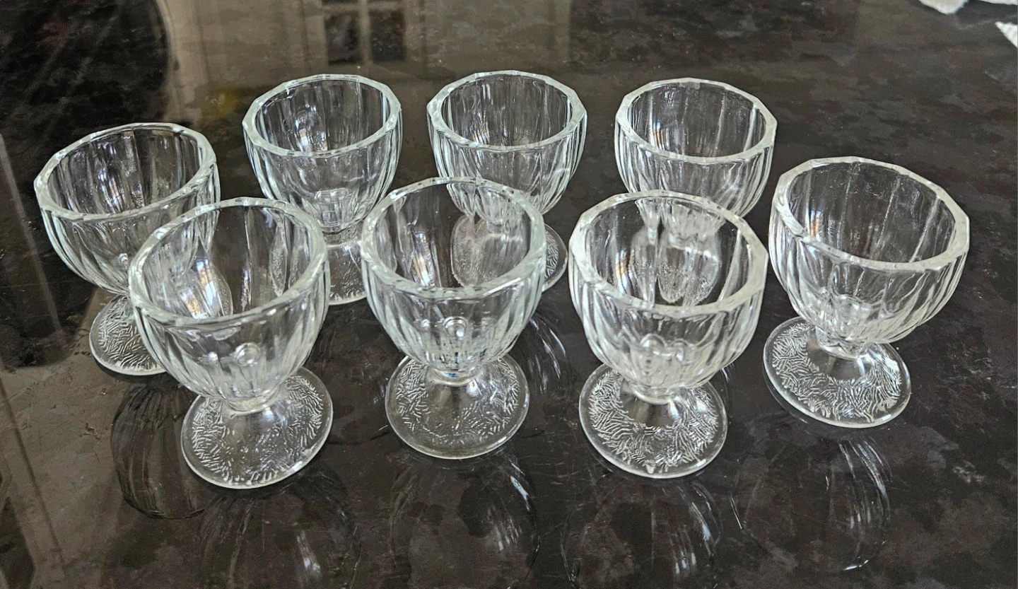 Elevate your table with this set of 8 vintage egg cups, perfect for adding a touch of retro charm to your Easter breakfast/ brunch table. These delicate cups have a ribbed fluted glass with a frosted stem and are stamped with the letter "D". They are ready to cradle your soft-boiled eggs with style.