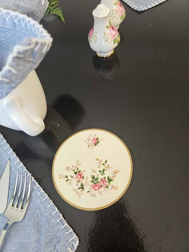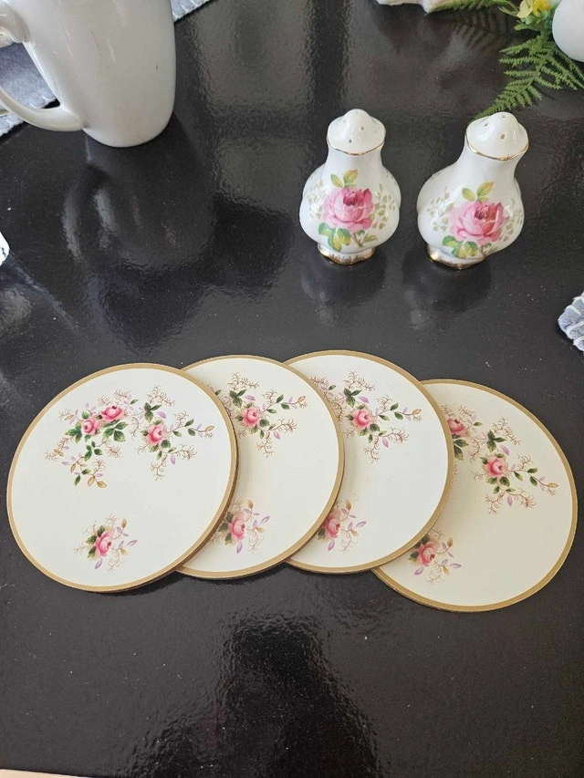 Add a touch of vintage elegance to your home with these Royal Albert coasters, perfect for protecting your furniture in style. This set of four coasters comes in its original packaging, showcasing a delicate floral design that exudes classic charm. These coasters are new in box.
