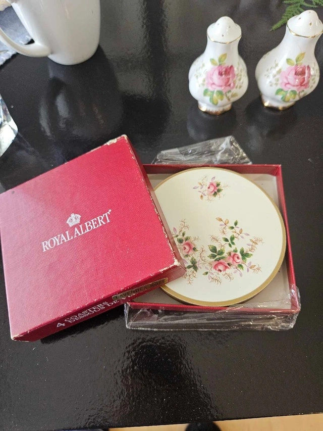 Add a touch of vintage elegance to your home with these Royal Albert coasters, perfect for protecting your furniture in style. This set of four coasters comes in its original packaging, showcasing a delicate floral design that exudes classic charm. These coasters are new in box.