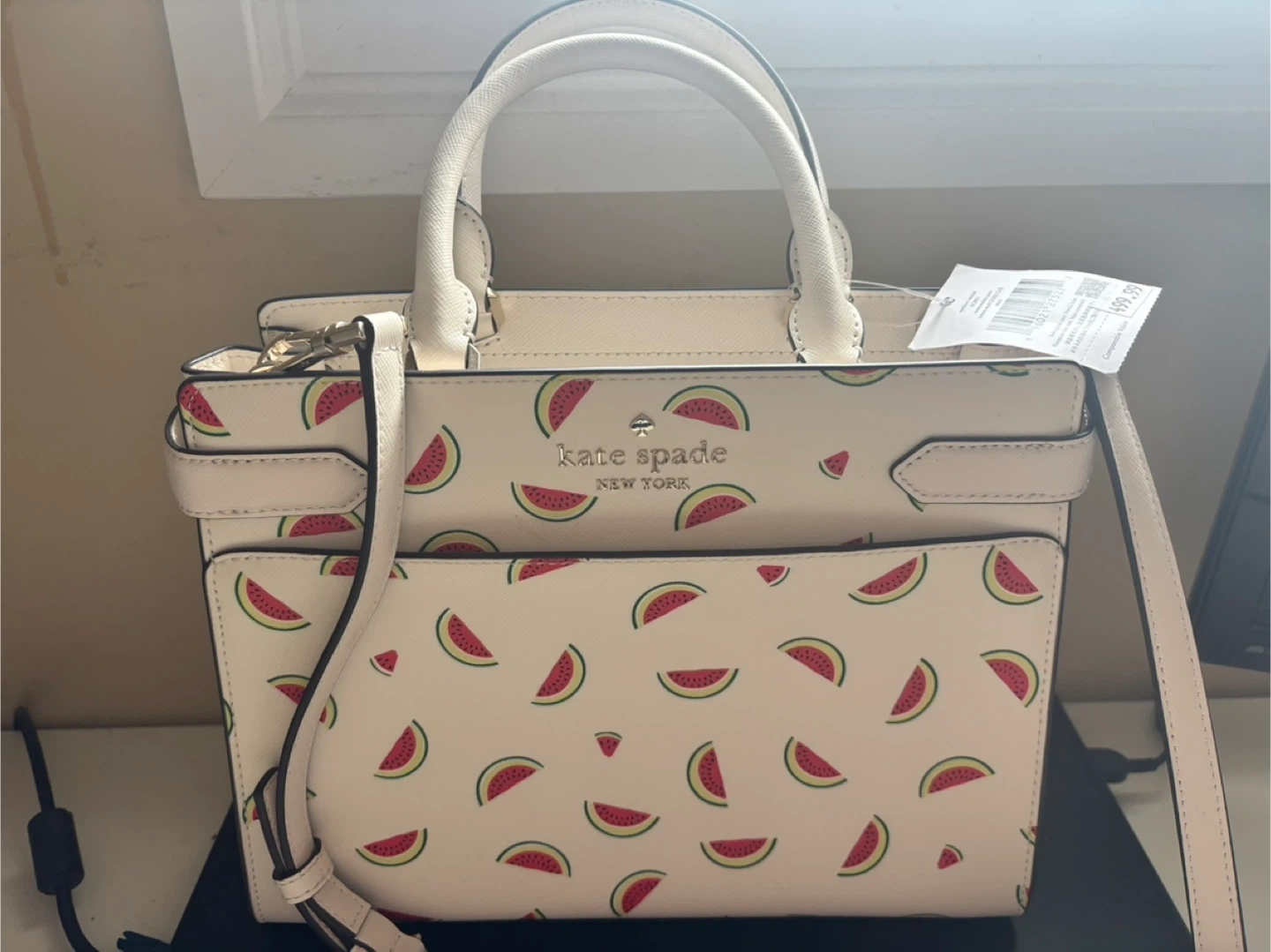 A Kate Spade New York satchel bag with a fun watermelon print. It's white with a watermelon design and has dual top handles with an adjustable shoulder strap. This bag is perfect for adding a pop of colour to your everyday style!