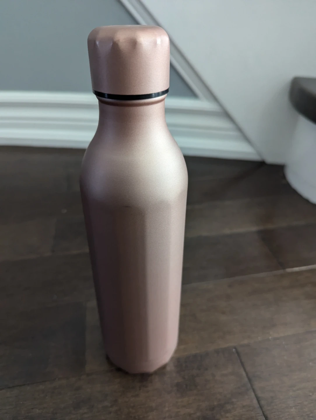 A reusable water bottle in a lovely rose gold colour. It's perfect for staying hydrated on the go. The bottle is made of durable metal. This is a great bottle for everyday use!