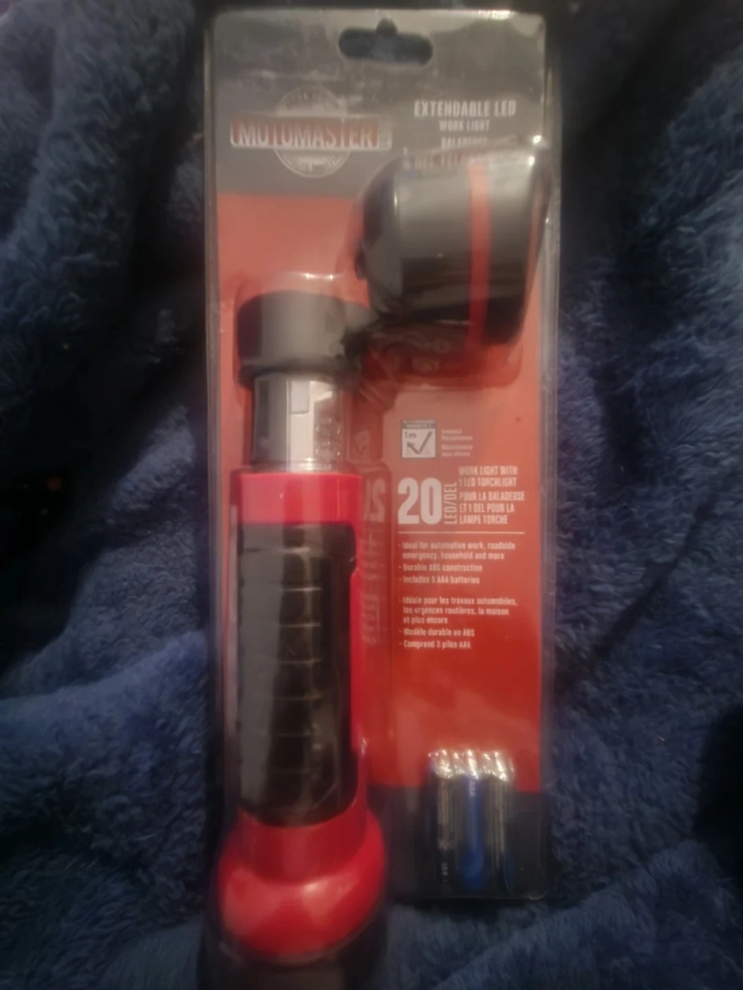Selling a brand new MotoMaster work light with an LED torchlight! It's ideal for automotive work, roadside emergencies, household use and more. It features durable ABS construction and includes 3 AAA batteries. Comes in its original packaging. Pickup only. Cash preferred