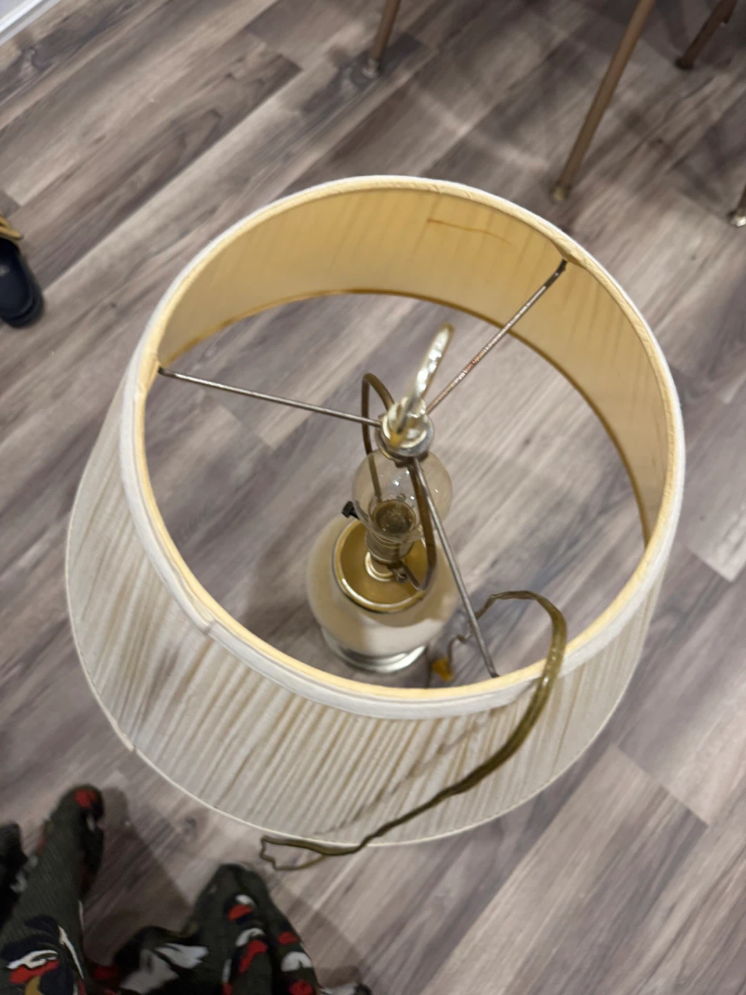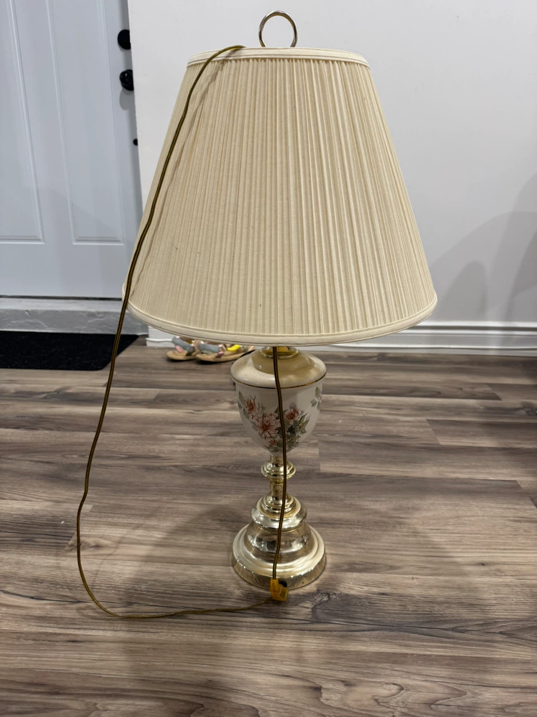 Selling a lovely vintage table lamp with a floral design on the base and a pleated lampshade. It would add a touch of classic charm to any room!