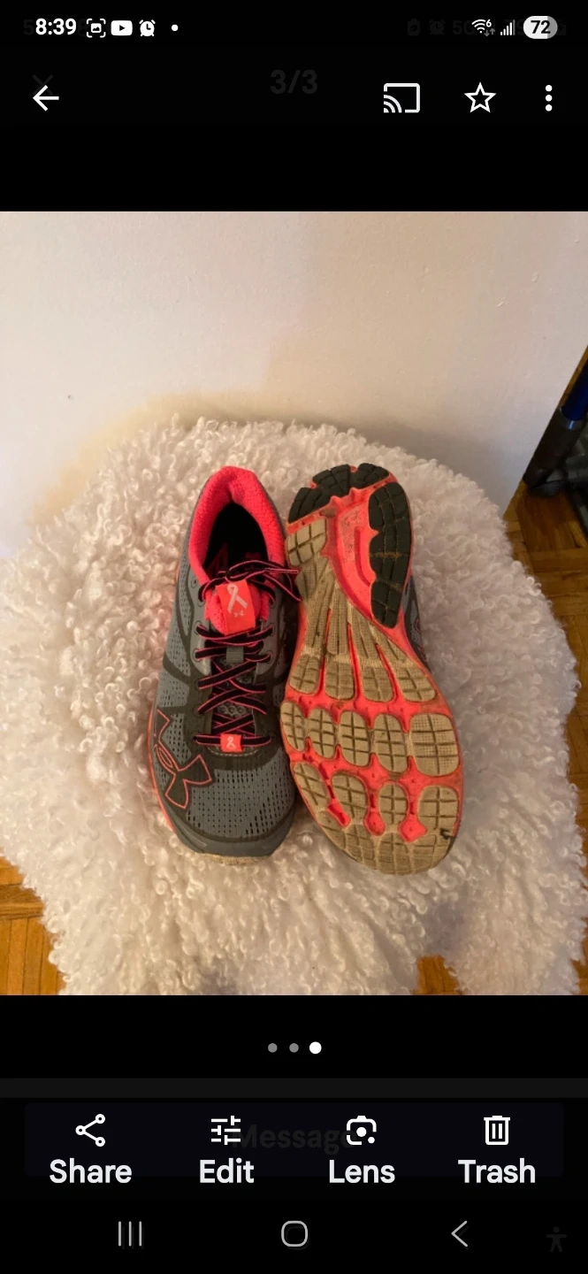 Grey and pink Under Armour running shoes. Lace-up closure with durable soles.