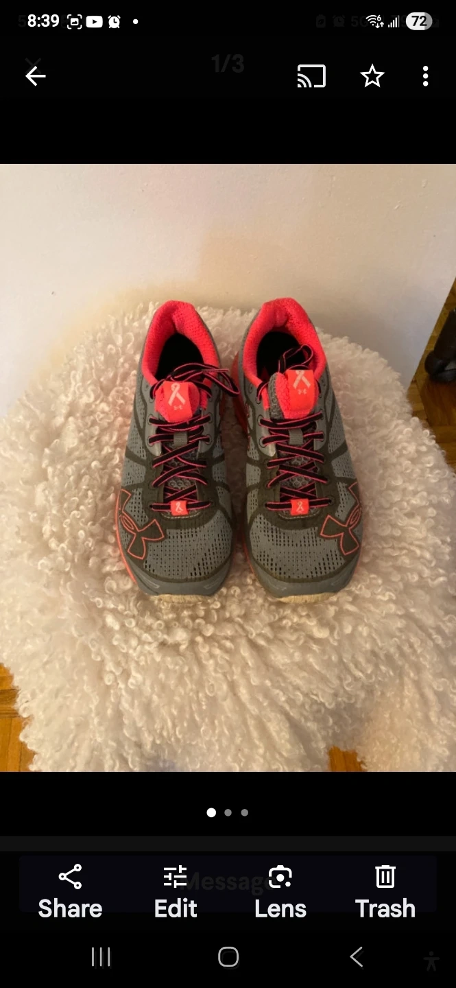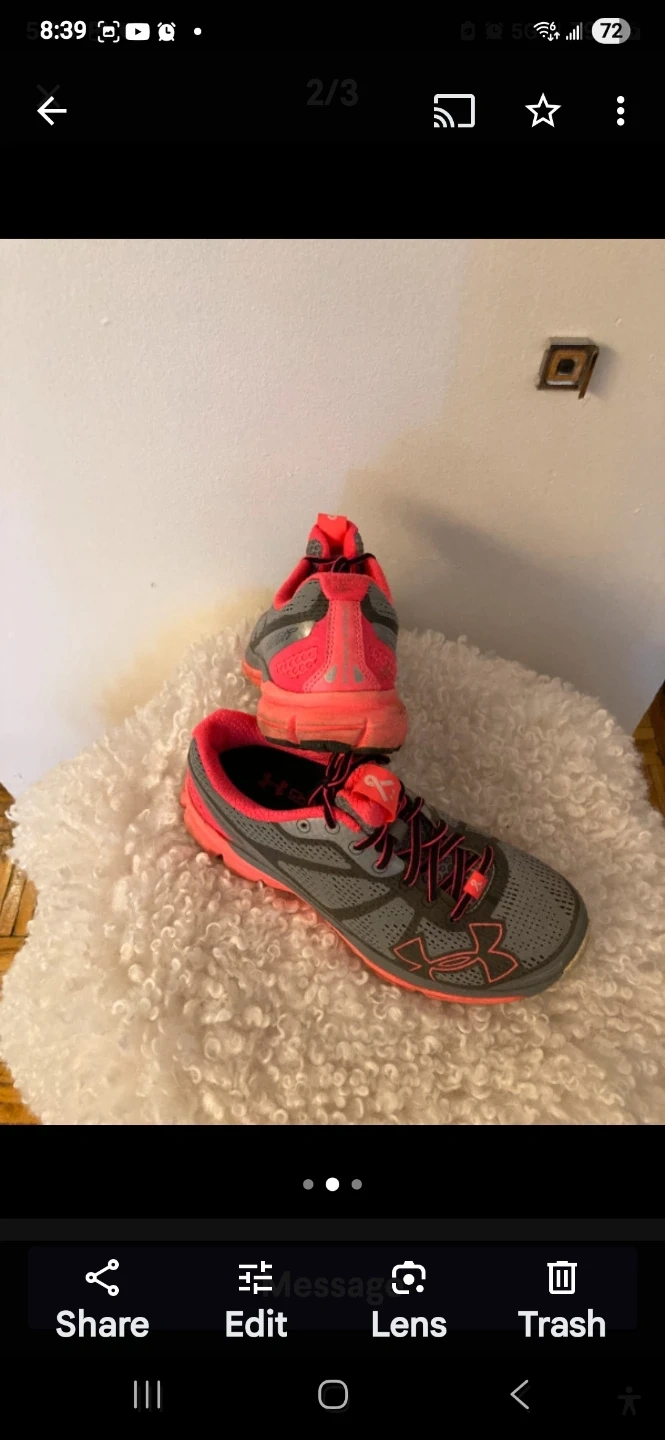 Grey and pink Under Armour running shoes. Lace-up closure with durable soles.