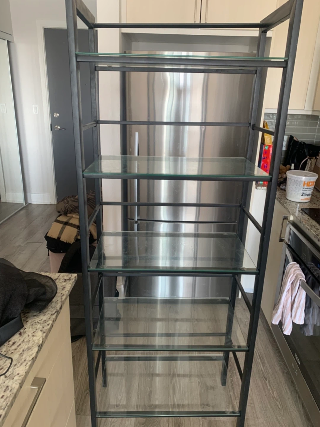 This is a metal and glass shelf unit. It has five glass shelves and a black metal frame. It's a great piece for storage or display.