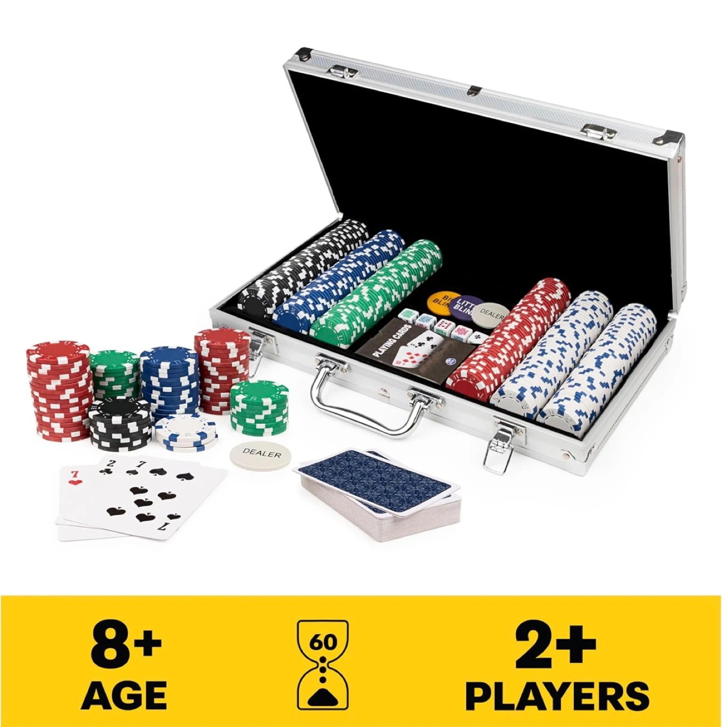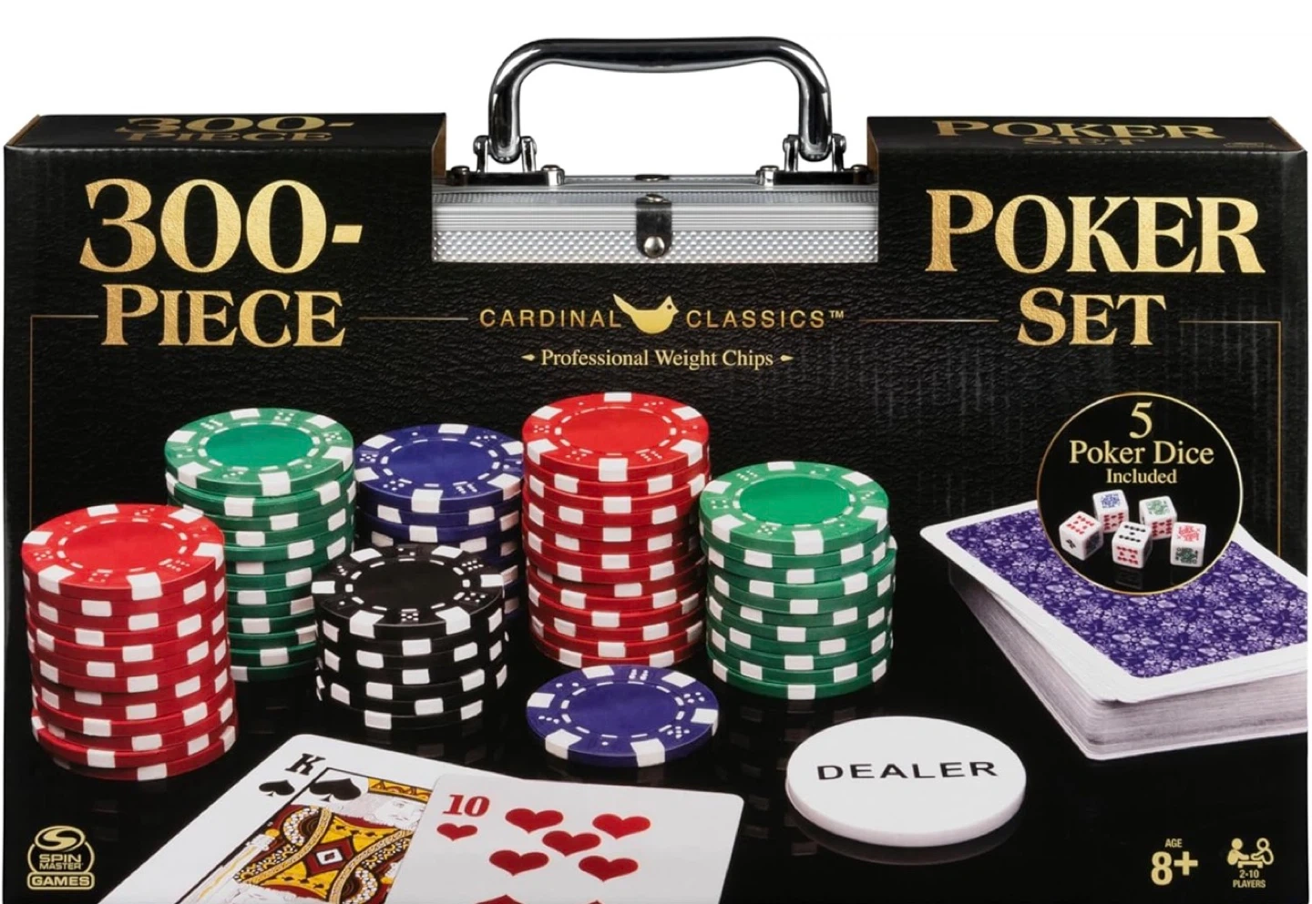 This is a 300-piece poker set from Cardinal Classics, designed for professional weight chips. It includes playing cards, poker dice, and a durable aluminum case for storage and transport. Recommended for ages 8 and up, it's great for game nights with friends and family.
