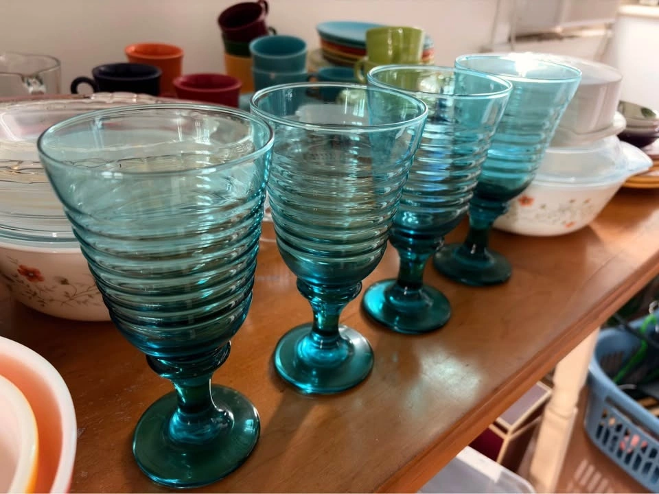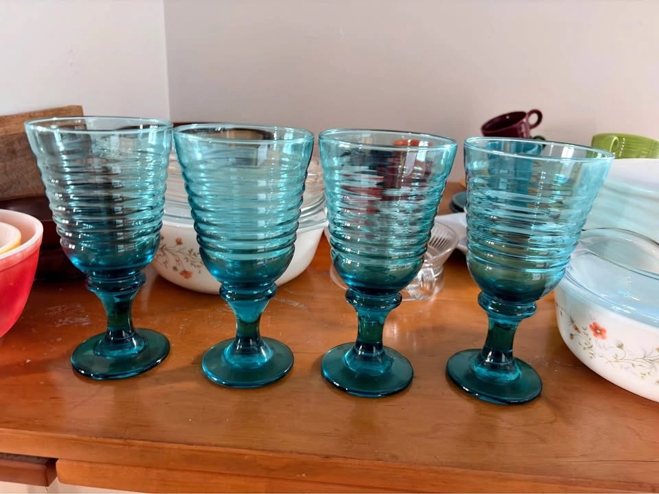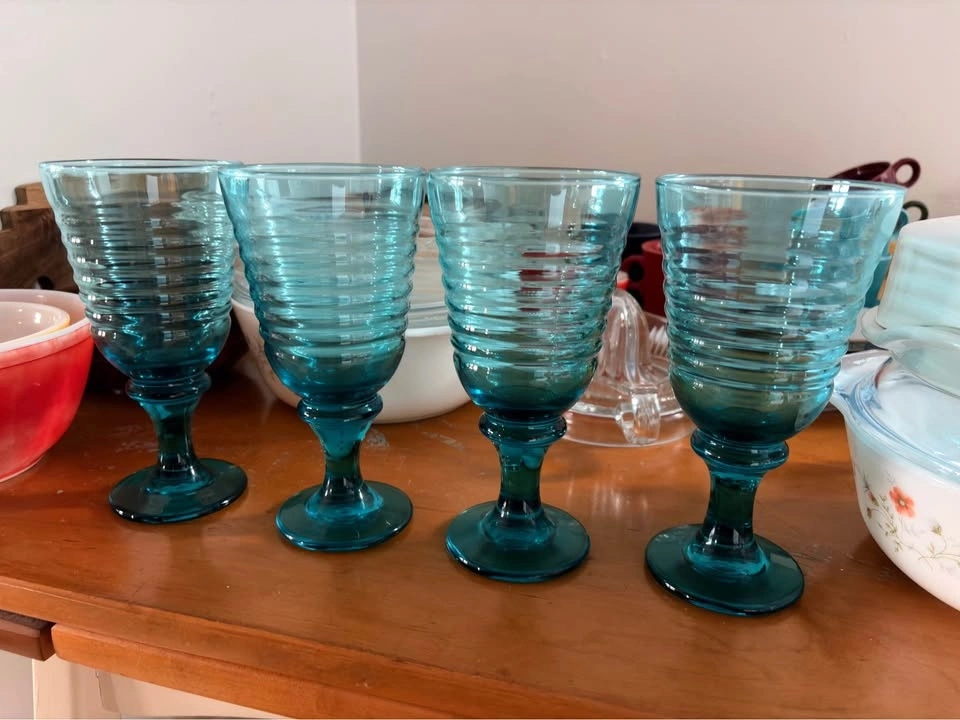 Vintage Libbey Sirrus glass water goblets in rare teal/turquoise “ocean”. A set of 4.
