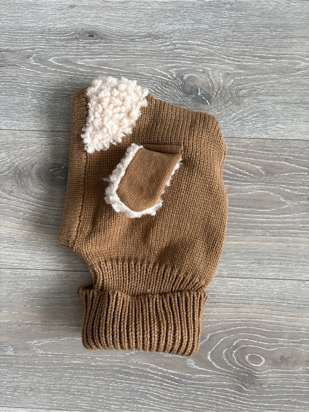 A cozy knit balaclava hat in a warm brown colour. It has cute little ears and a sherpa lining for extra warmth. This hat is perfect for keeping little ones snug on chilly days!