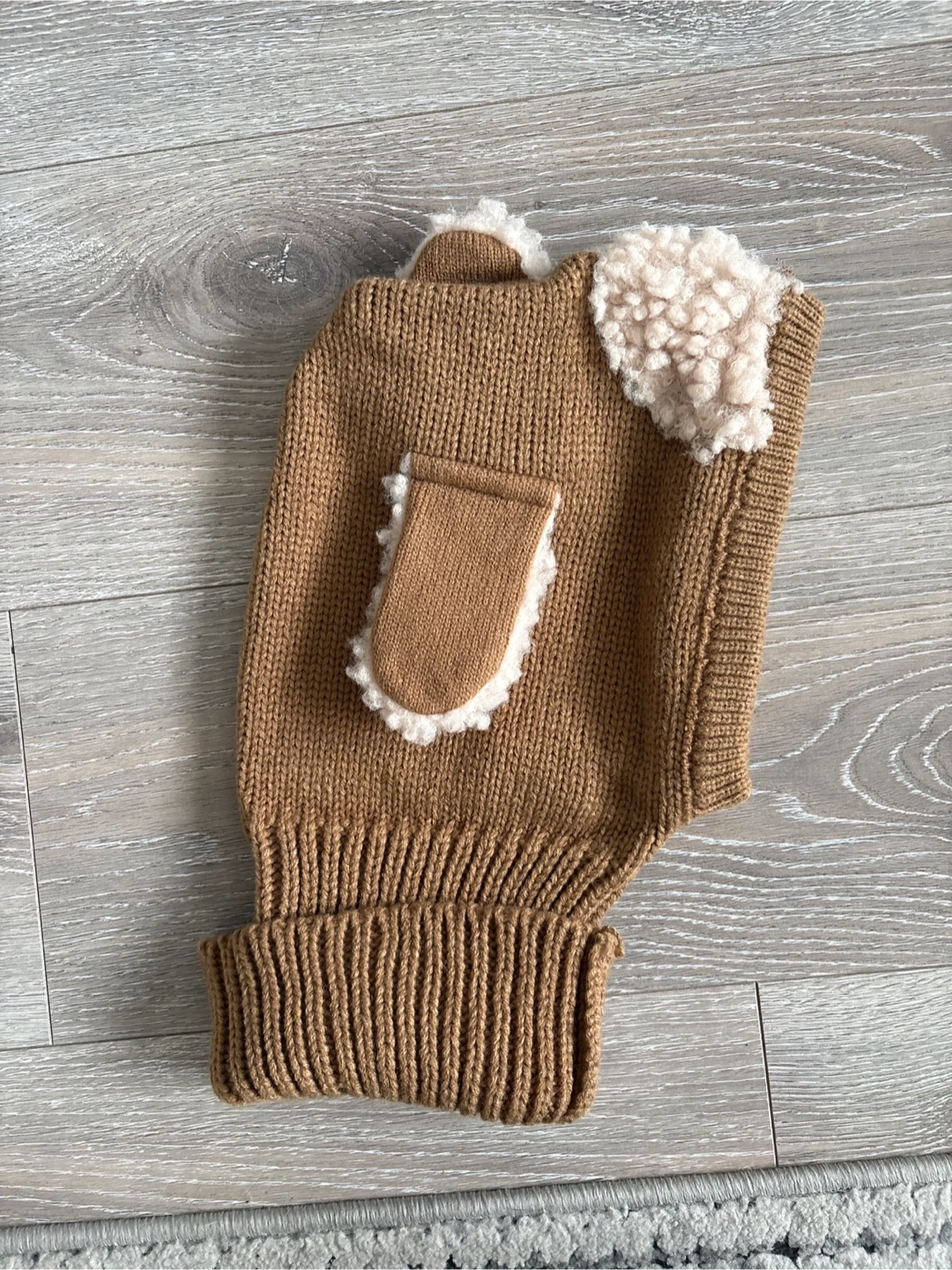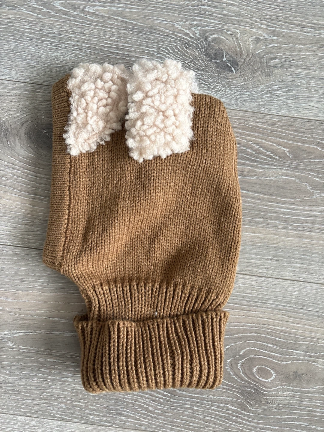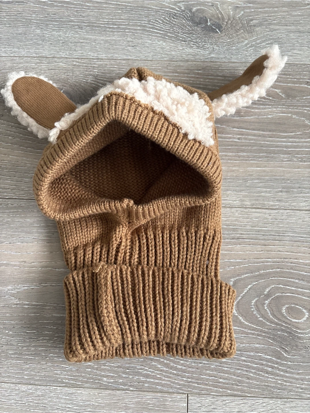 A cozy knit balaclava hat in a warm brown colour. It has cute little ears and a sherpa lining for extra warmth. This hat is perfect for keeping little ones snug on chilly days!