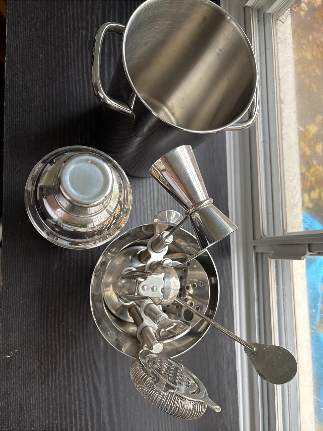 Selling a complete stainless steel cocktail shaker set! It includes everything you need to make delicious drinks at home. Perfect for parties or just enjoying a cocktail after a long day