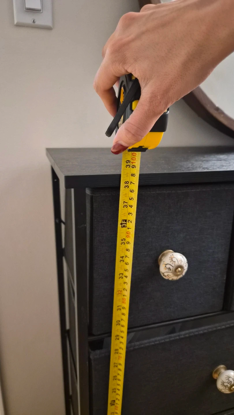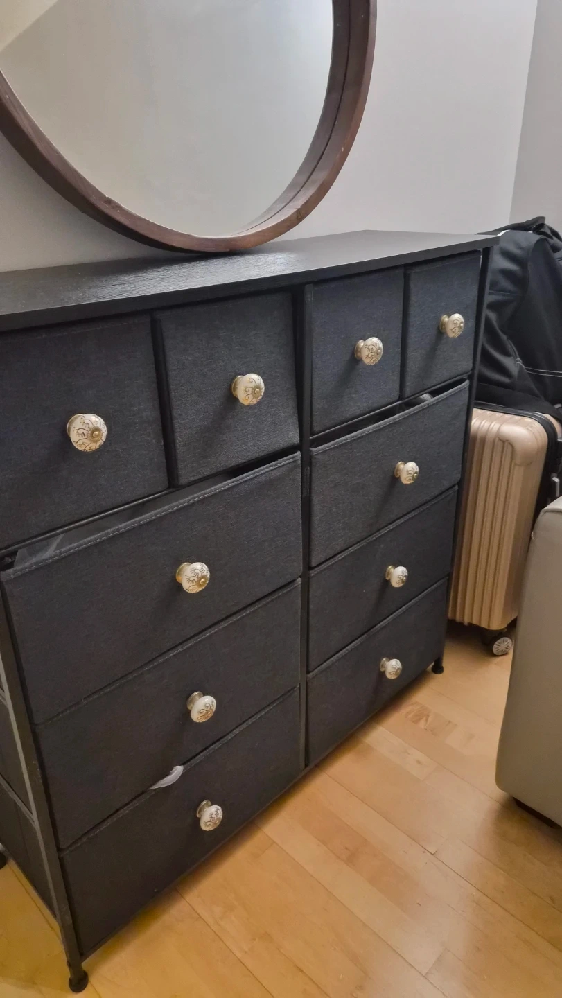 Looking to sell this dresser with fabric drawers! It's in great condition and has decorative knobs.