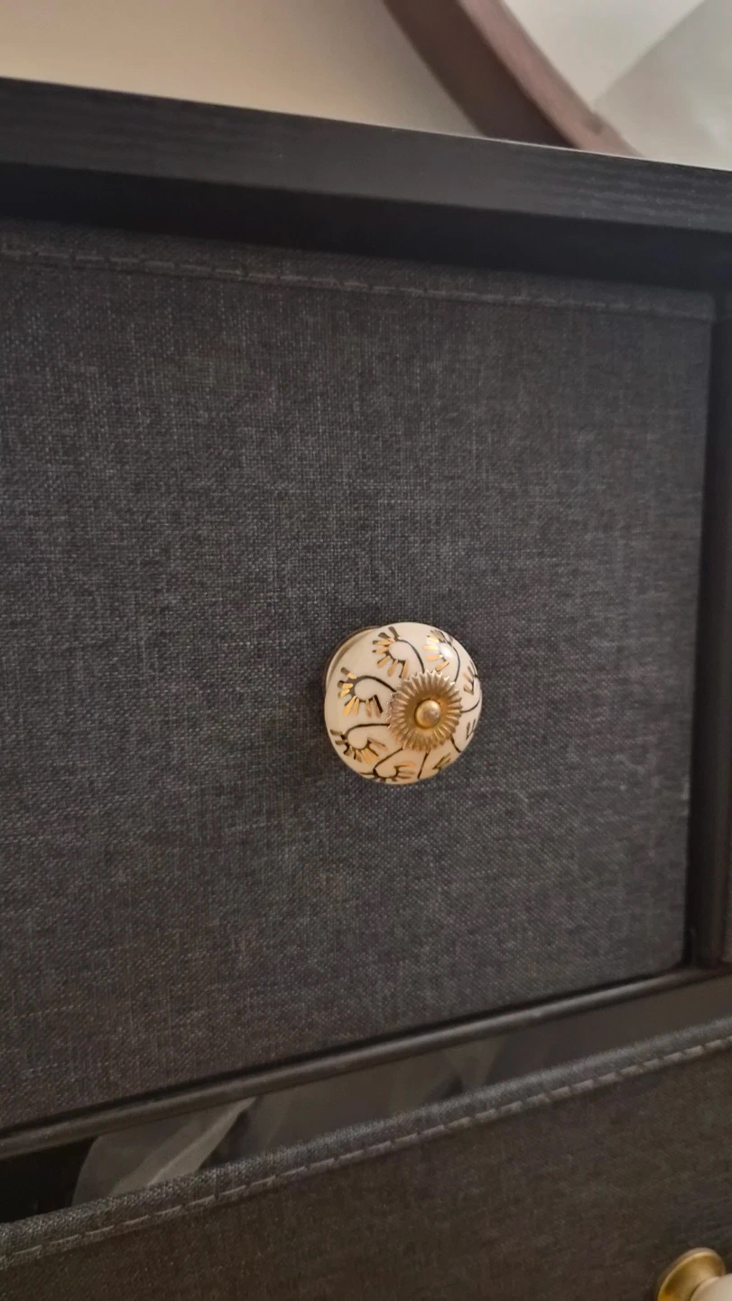 Looking to sell this dresser with fabric drawers! It's in great condition and has decorative knobs.
