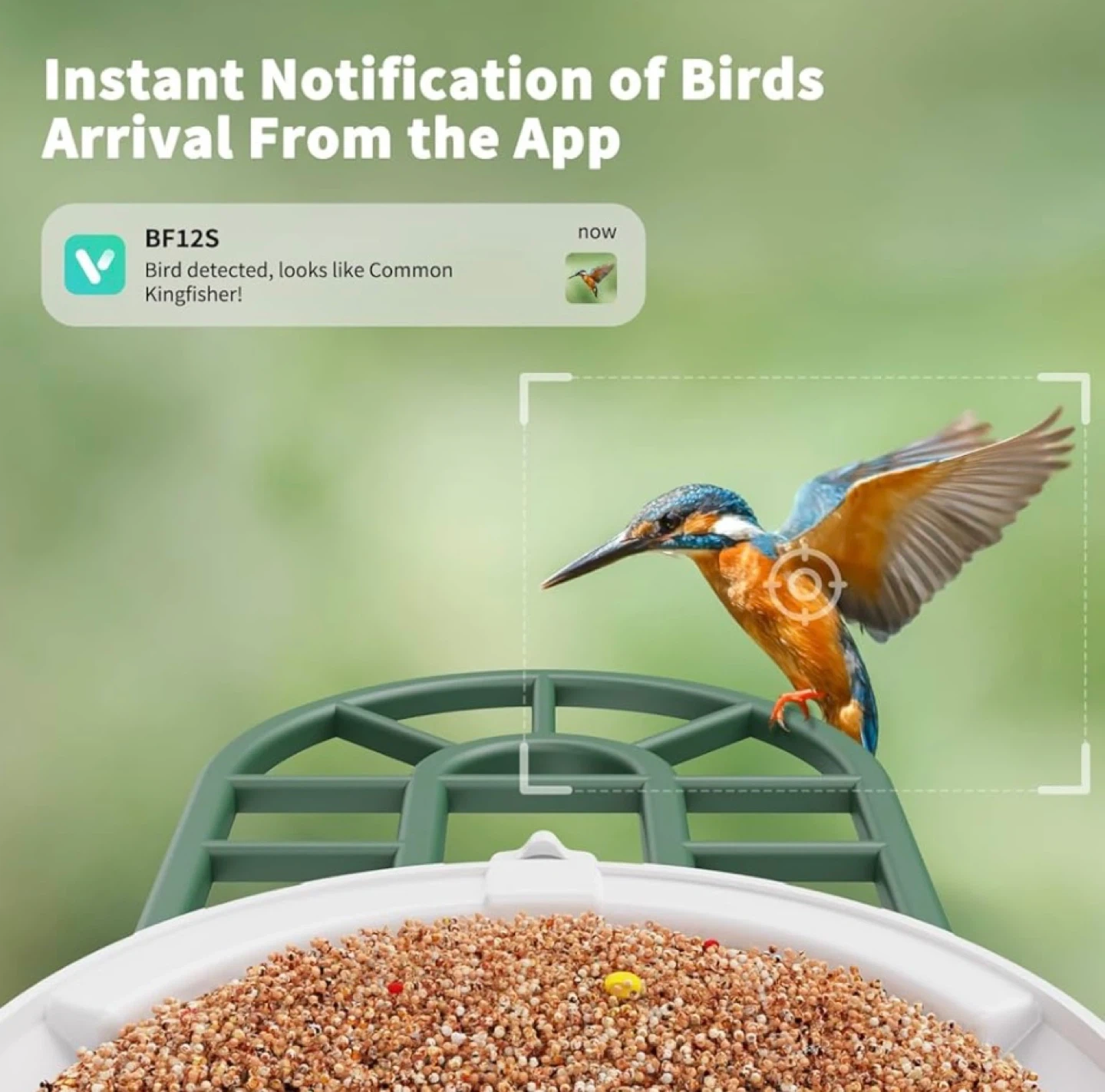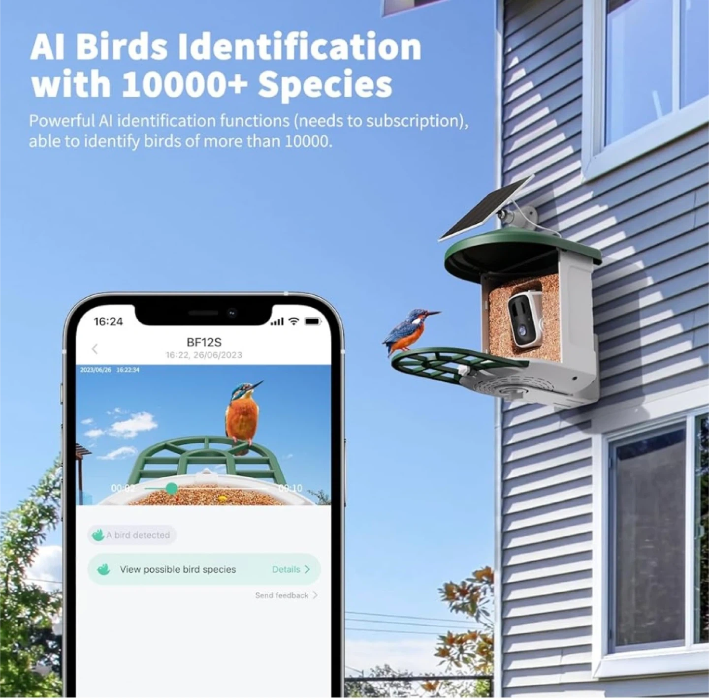 This smart bird feeder camera offers AI bird identification with over 10000 species. It features a 6W solar panel for continuous power and a 120-degree viewing angle. Get instant notifications of bird arrivals right to your app!