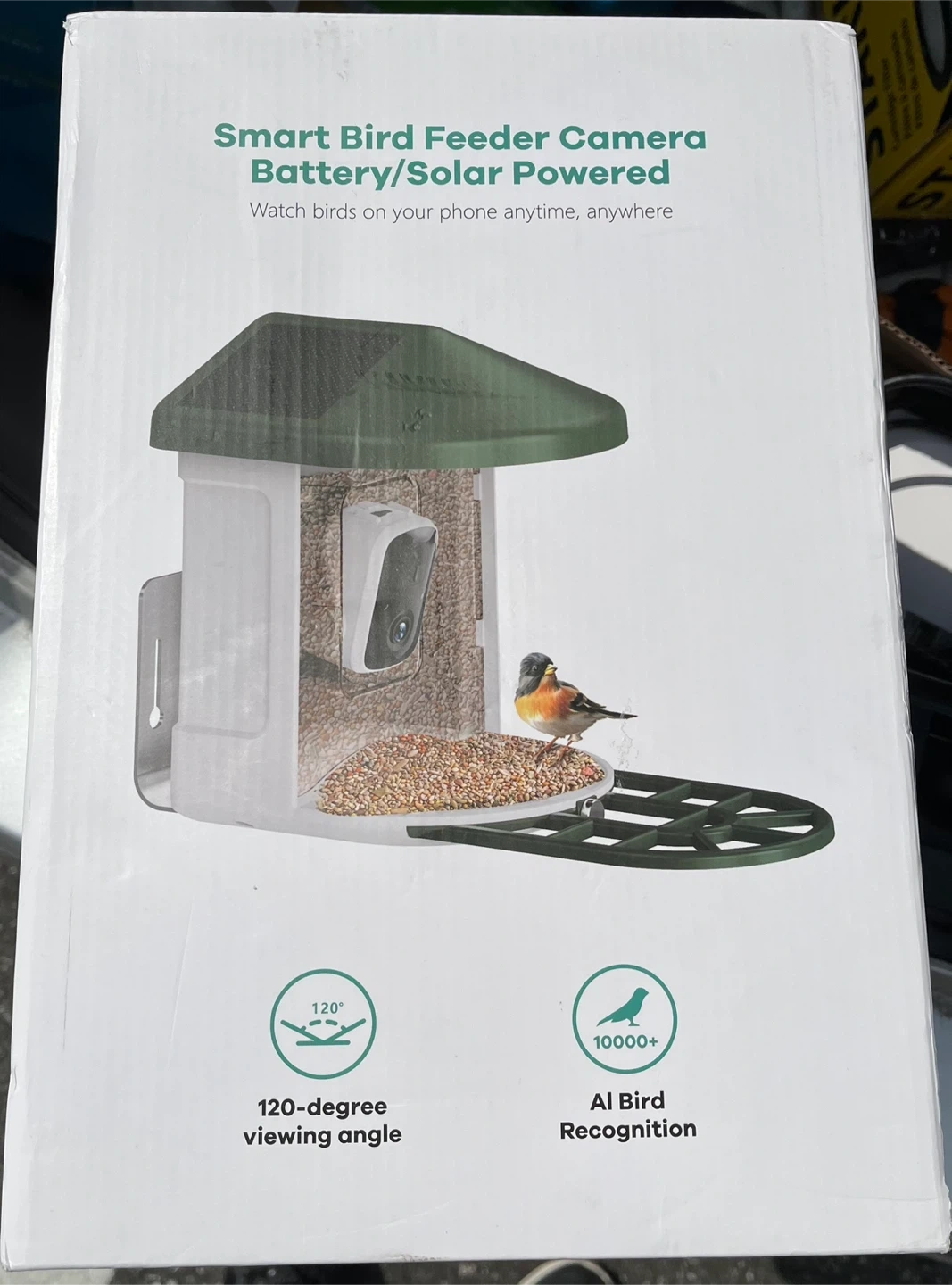 This smart bird feeder camera offers AI bird identification with over 10000 species. It features a 6W solar panel for continuous power and a 120-degree viewing angle. Get instant notifications of bird arrivals right to your app!