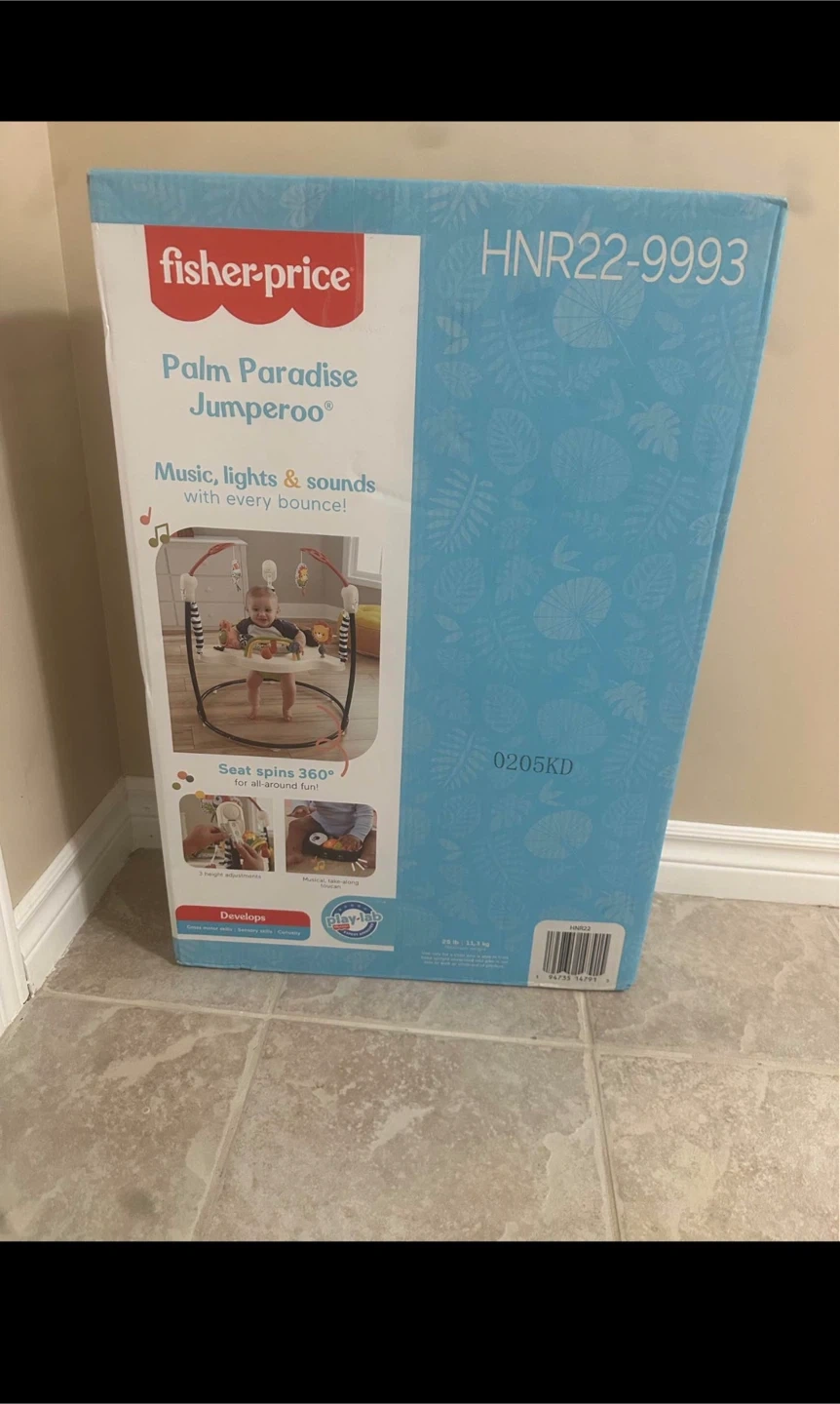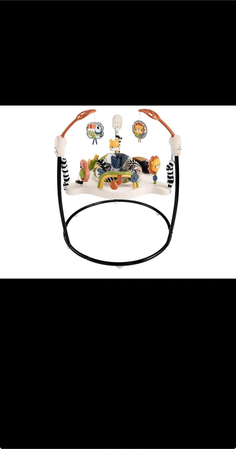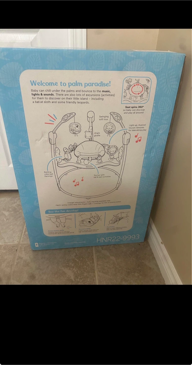 Welcome your baby to palm paradise with this Jumperoo! It features music, lights, and sounds that activate with every bounce. The seat spins 360 degrees for full-on discovery and fun. Includes a bat-at sloth and friendly leopards for engaging play.