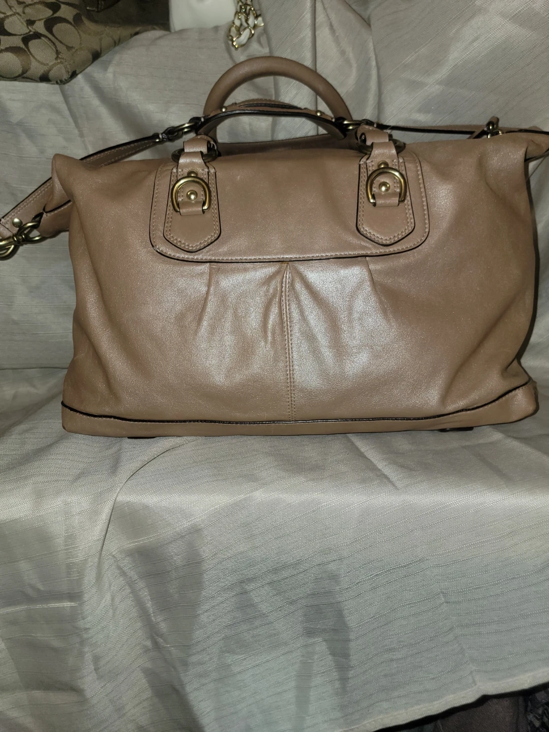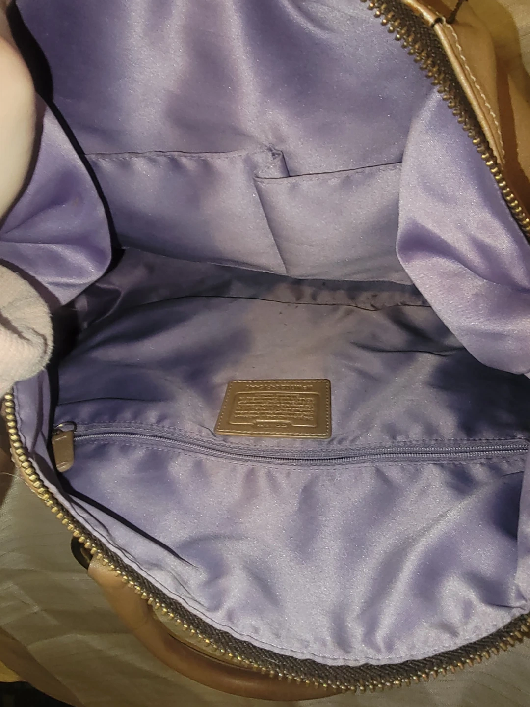 This is a Coach satchel handbag made of brown leather. It has a light purple satin lining with multiple interior pockets. Zipper closure on top.