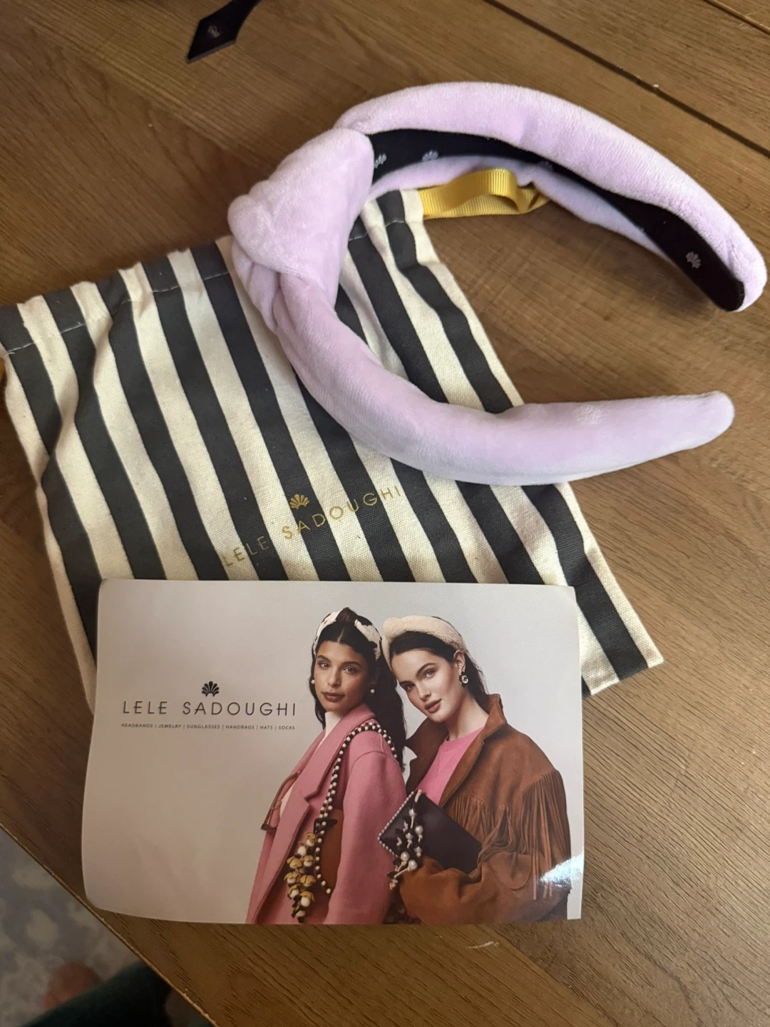 Lele Sadoughi padded headband in a soft lavender colour. It's made with a velvet-like material and comes with its original dust bag. This headband is a stylish accessory for any occasion!
