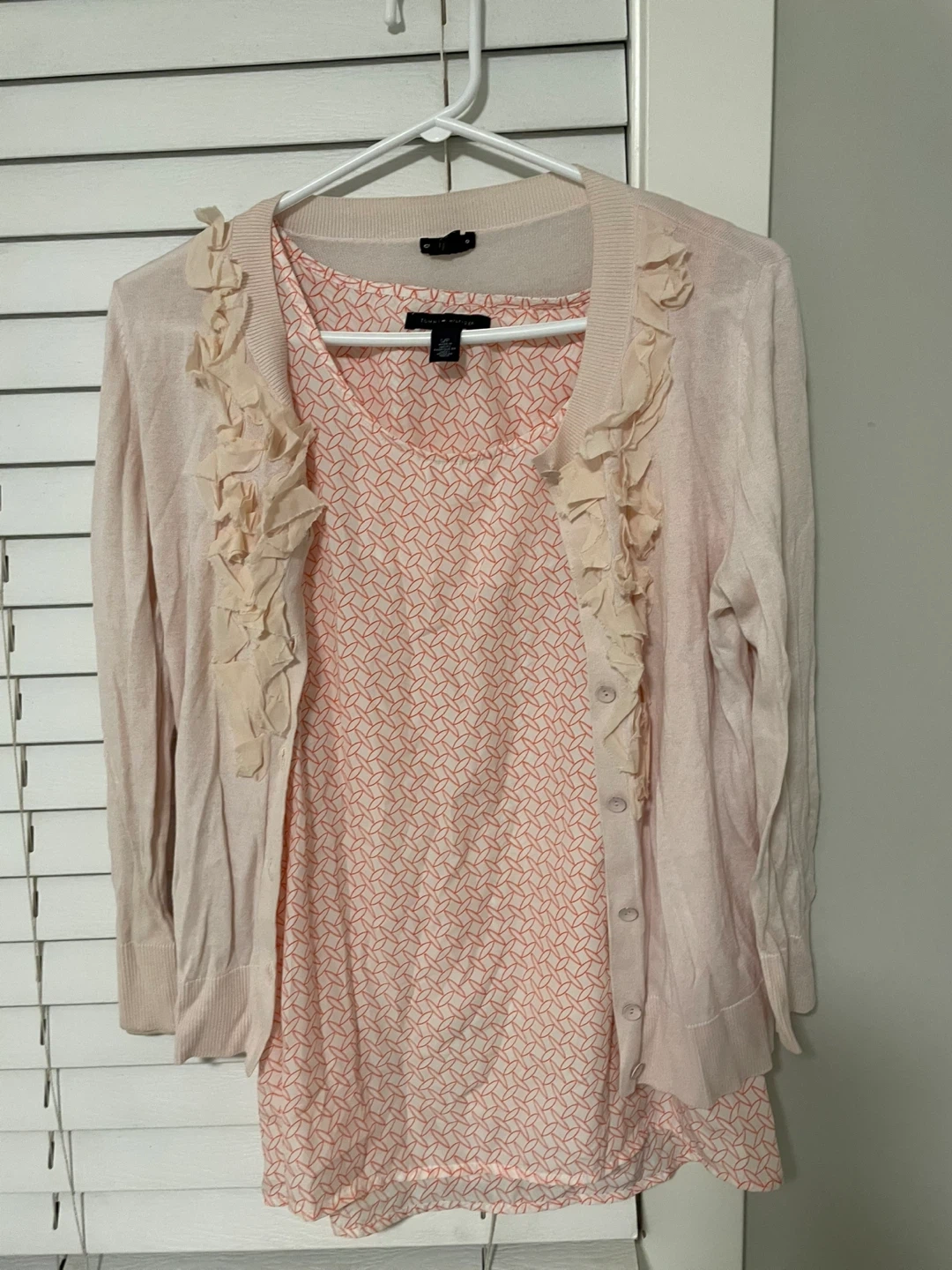 💛pink cardigan🩵 (TALBOTS lightweight) with ruffled trim and a matching pink printed blouse. Cardigan has button closure. Set is size medium.