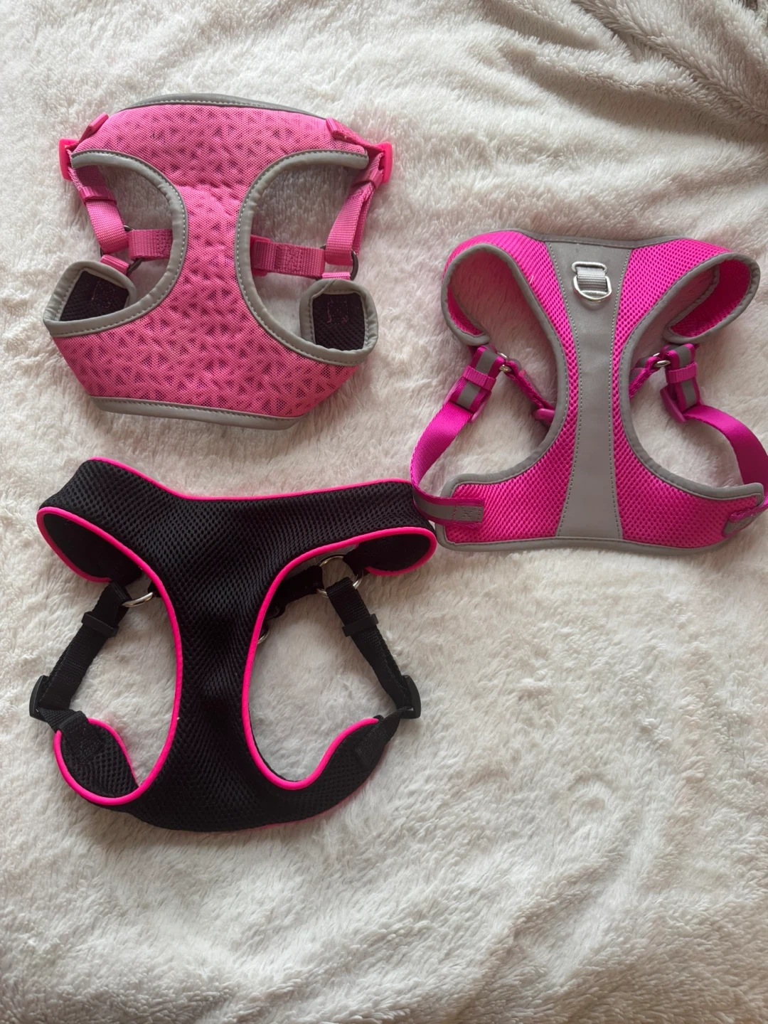 Selling a lot of new dog harnesses! There's a variety of styles, colours, and sizes available. Perfect if you're looking to try out different fits for your furry friend or need some backups. Take a look at the pictures to see the selection!