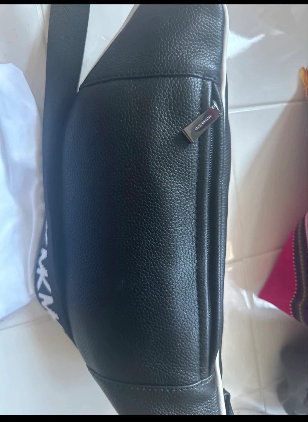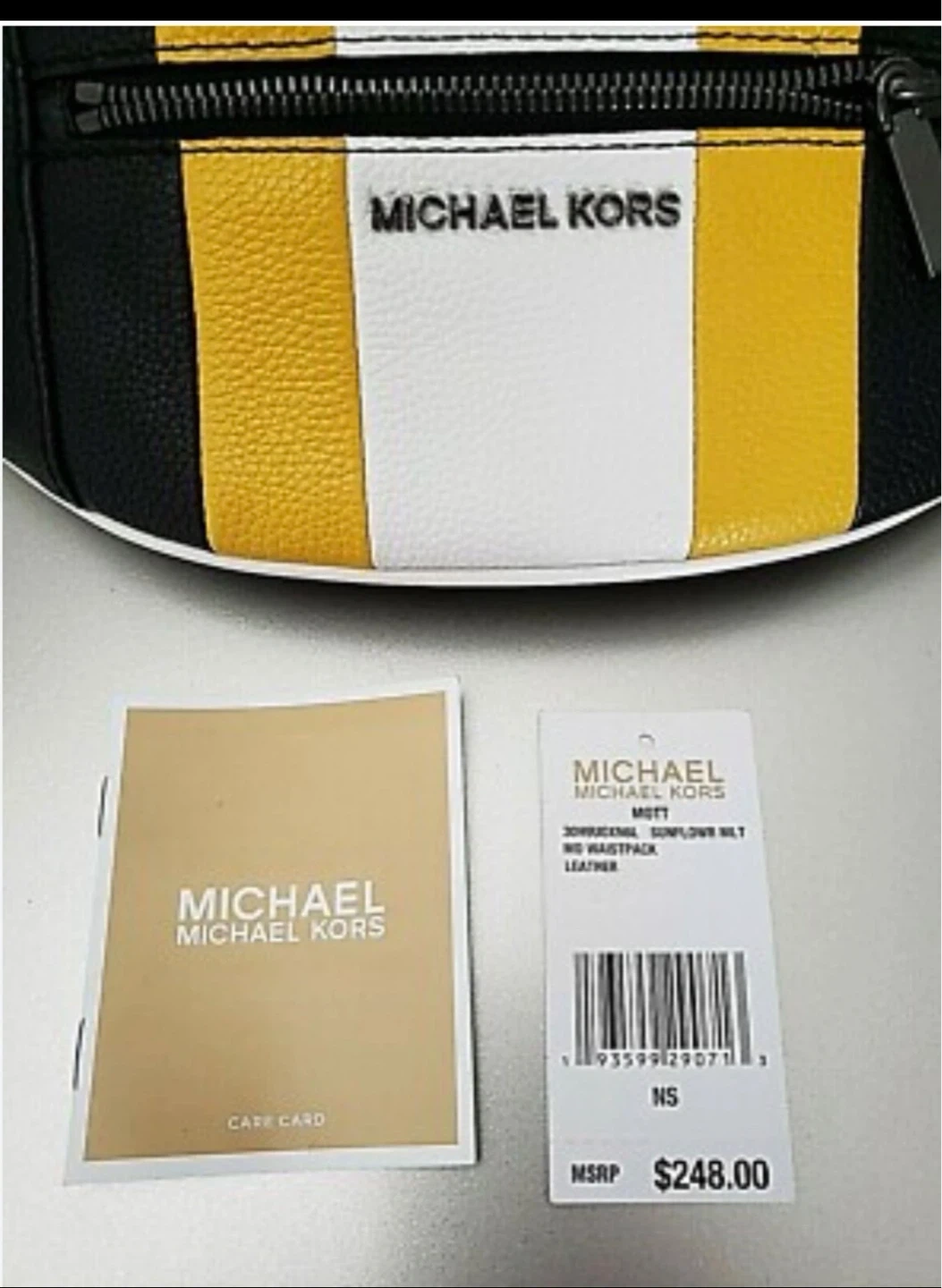 This Michael Kors belt bag is made from leather. It features a colorful stripe design with black, white, and yellow accents. The bag includes a dust bag and care card.