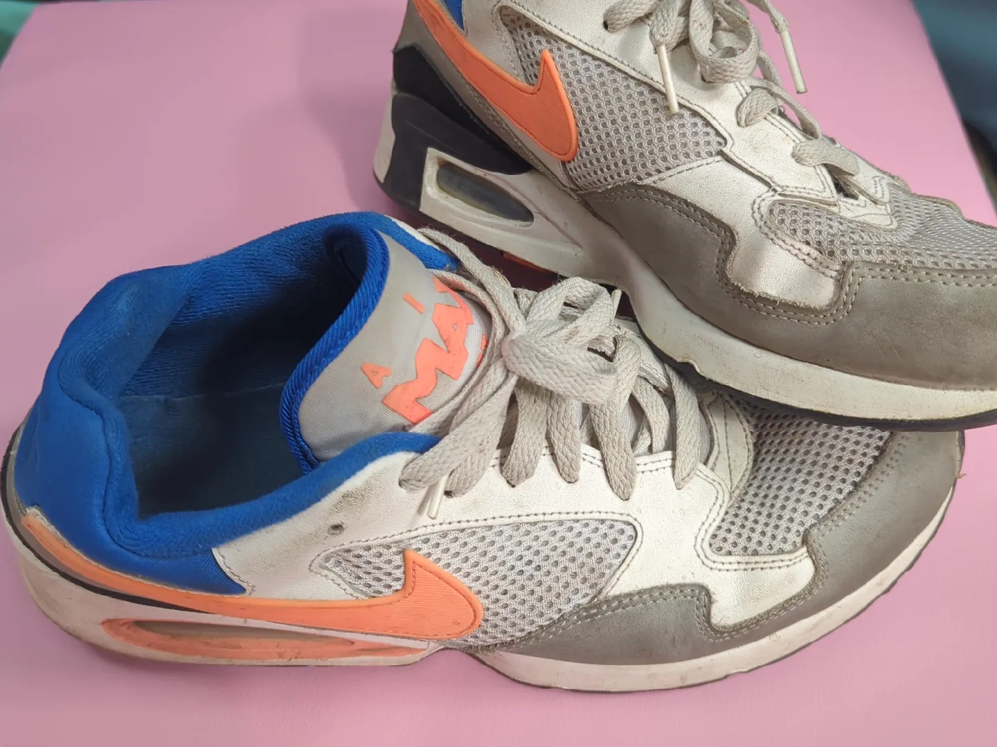 Selling a pair of used Nike Air Max IVO sneakers in US size 10! These sneakers feature a stylish design with a mix of white, grey, blue, and orange accents. They're perfect for casual wear or workouts. Don't miss out!🥕