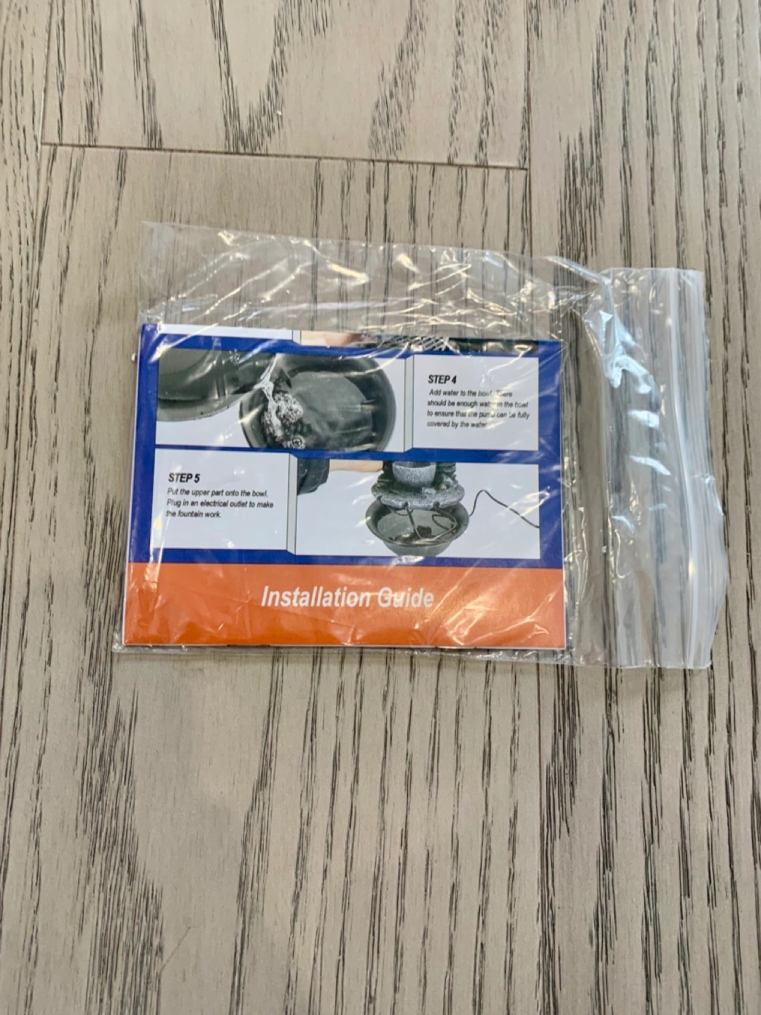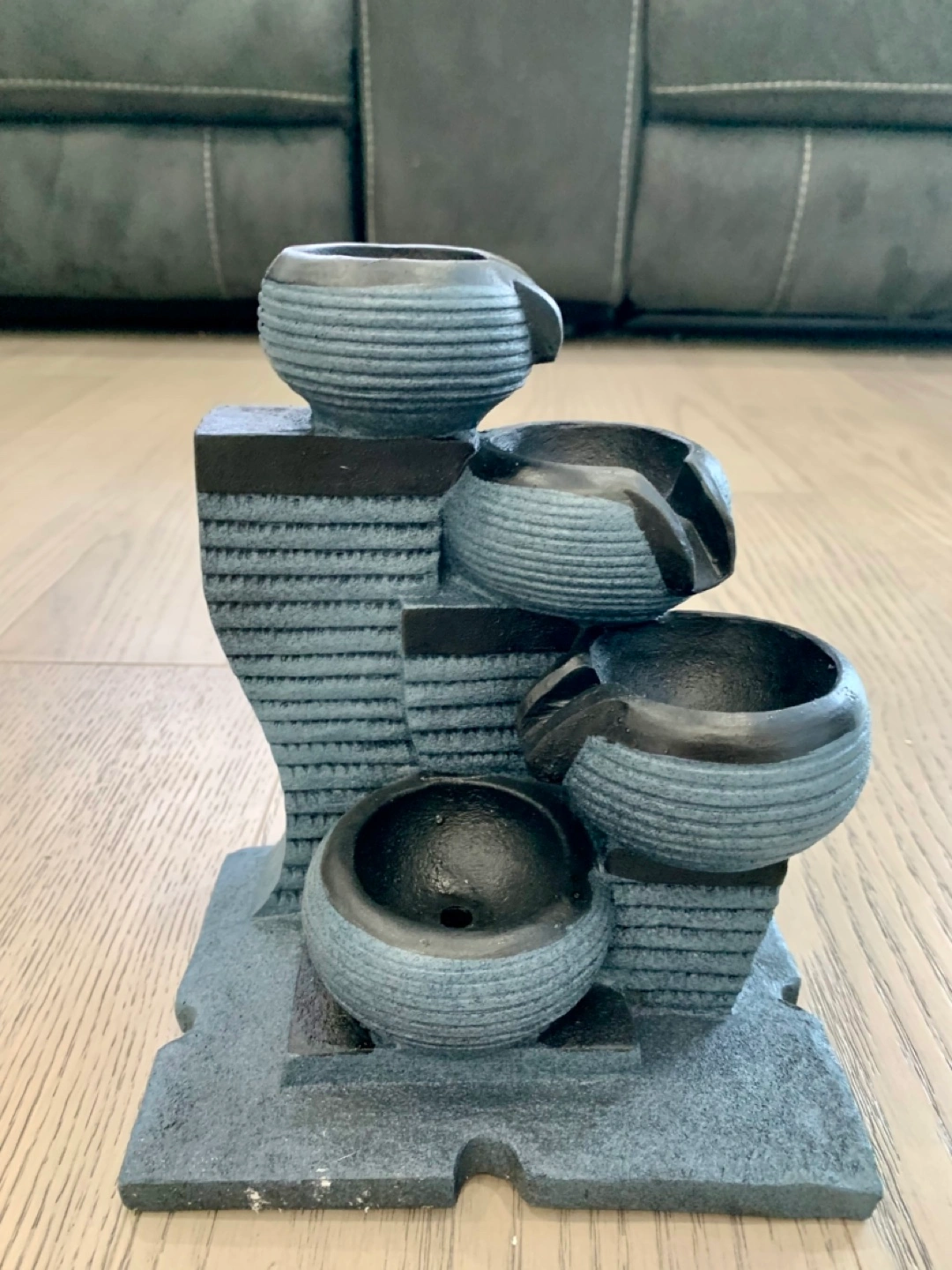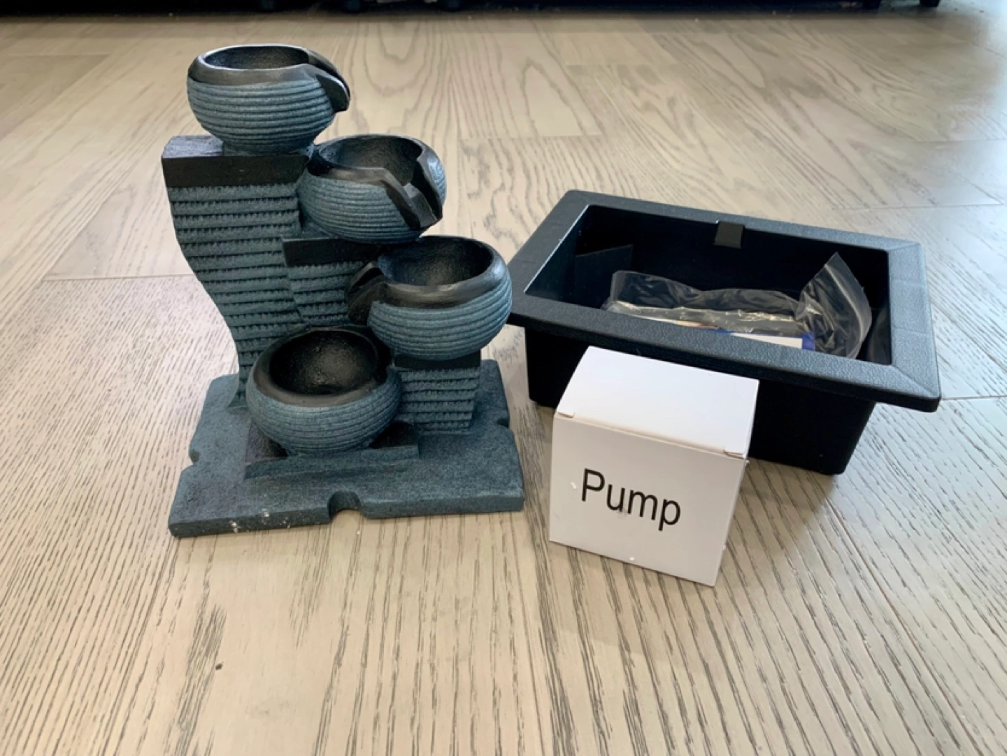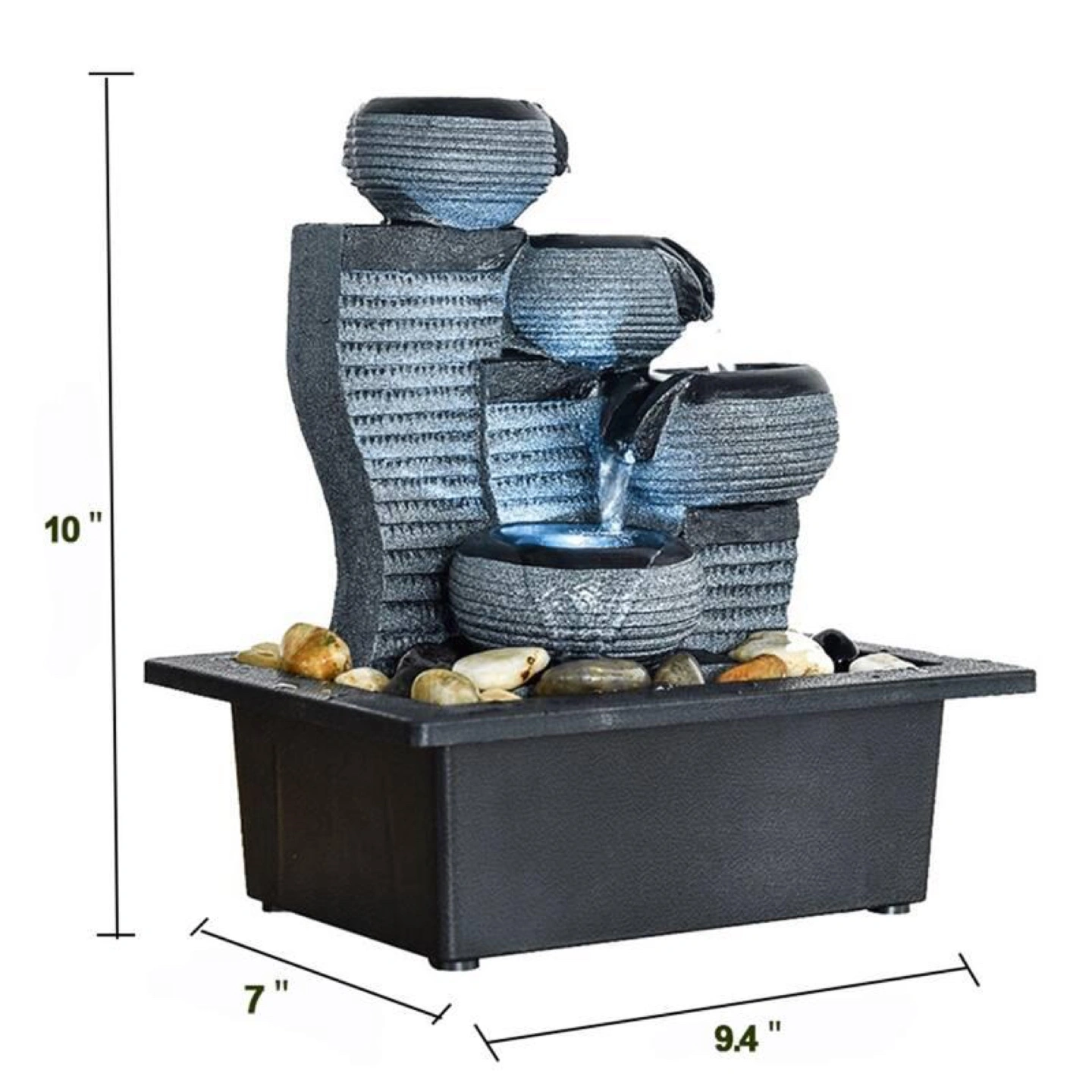 Relaxing tabletop water fountain. Features four tiers and LED light. Includes pump, basin, and instruction guide. Easy setup. Great for home décor. Does NOT come with rocks. DL FOR REAL PRICE