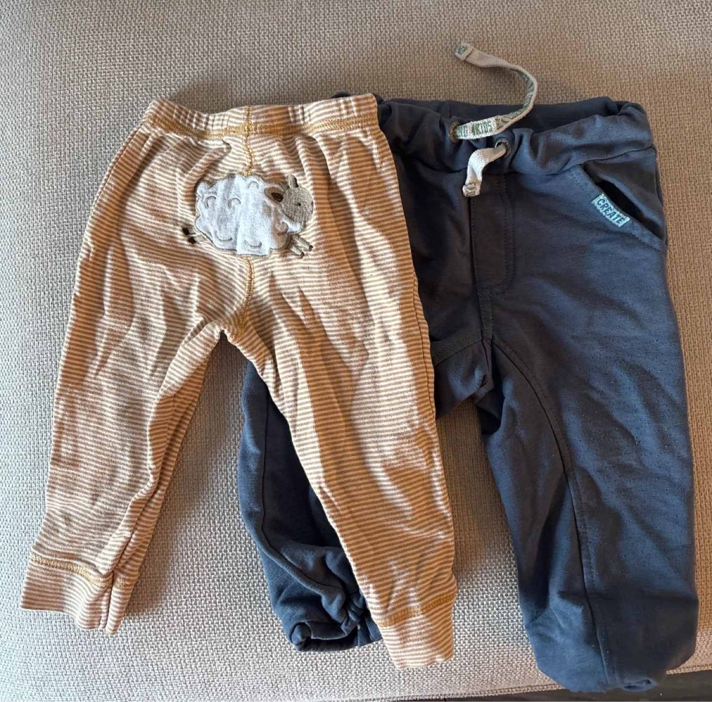 Two pairs of baby pants! One is striped with a cute sheep design, and the other is a solid colour with 'CREATE' on the pocket. Both are in good condition and ready for a new little one to wear.