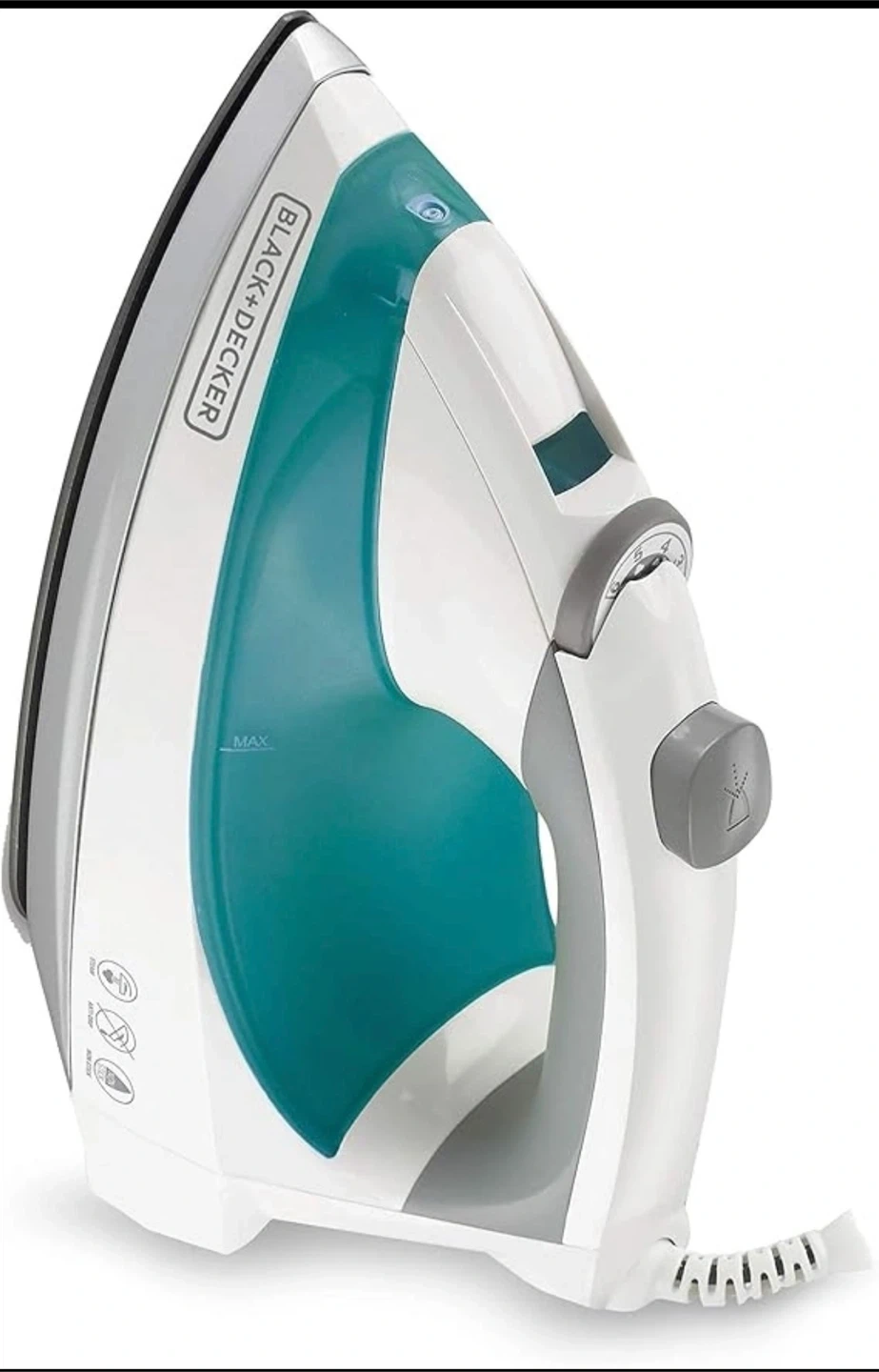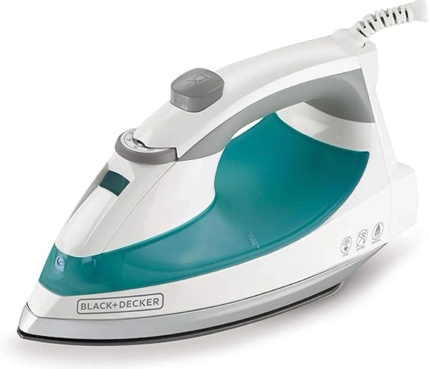 This BLACK+DECKER steam iron is white and teal. It's designed for easy wrinkle removal. Great for keeping your clothes looking sharp!
