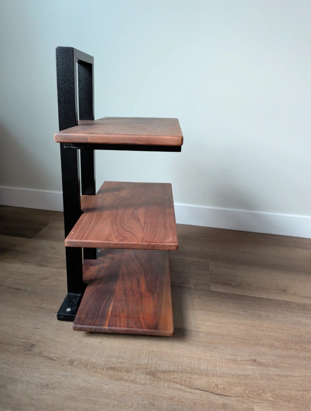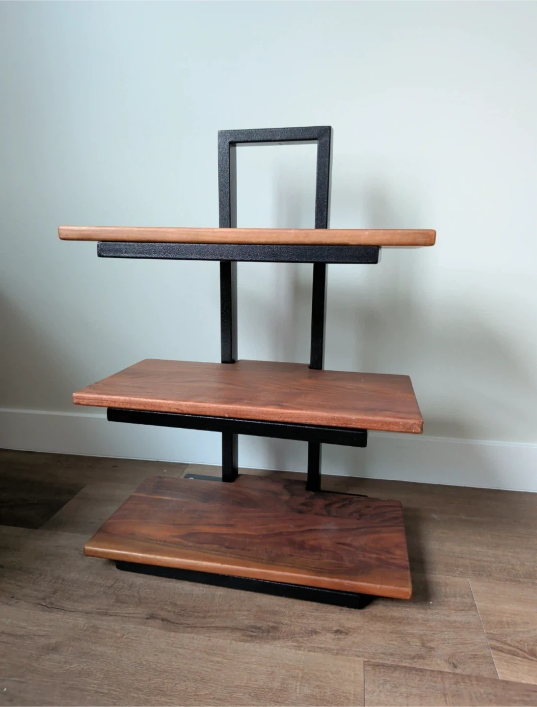 This three-tier audio rack holds your equipment! Features wooden shelves with a black metal frame. Sturdy construction, perfect for your stereo components.