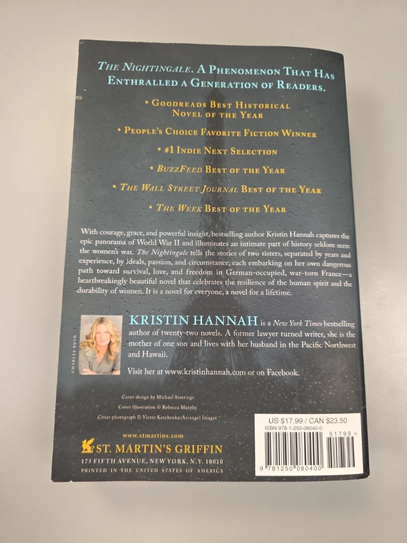 This is Kristin Hannah's The Nightingale, a New York Times bestseller. It's a novel about two sisters in France during World War II. The book received 'Heather's Pick' and has numerous other accolades.