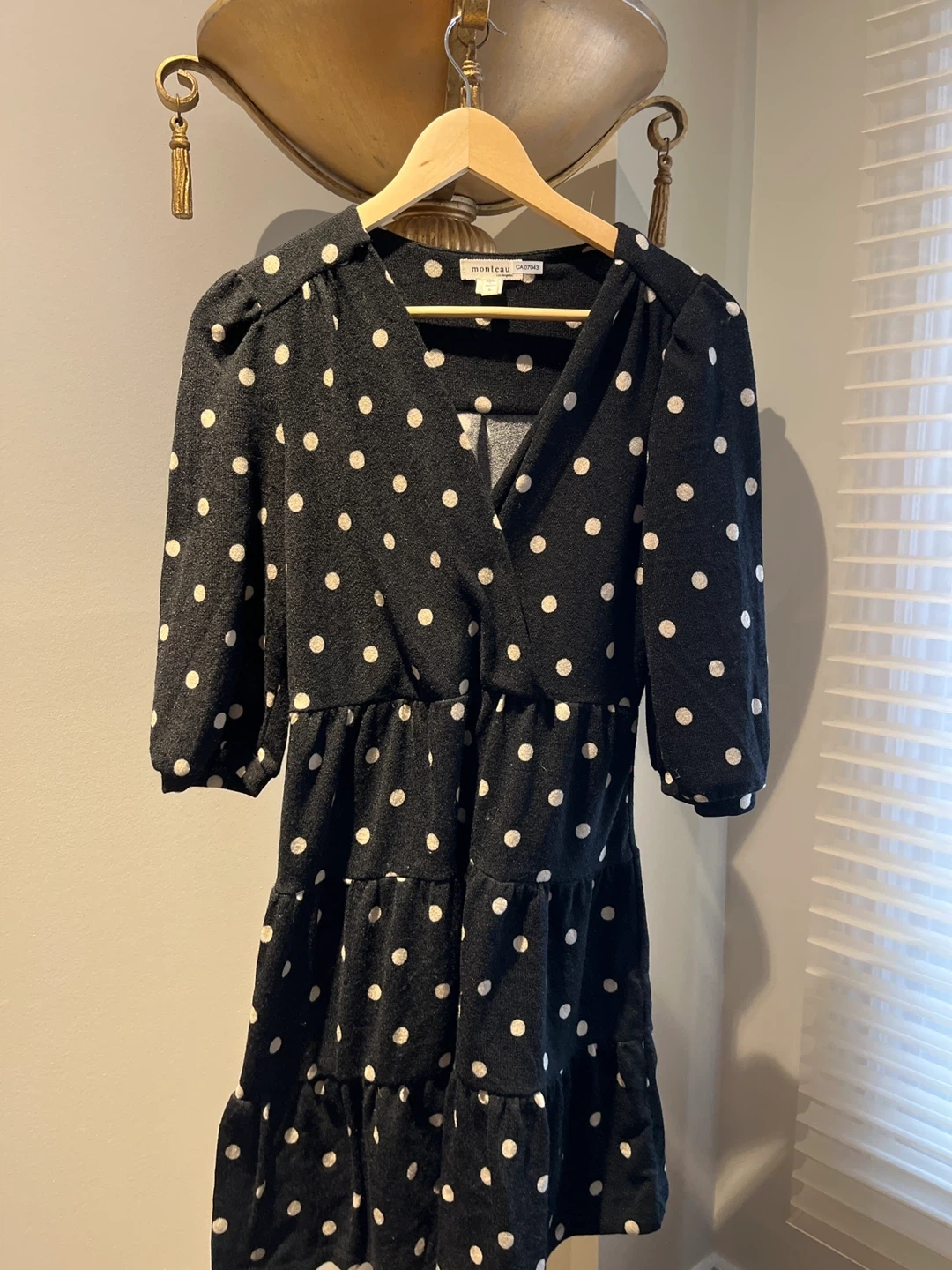 This Monteau dress features a classic black and white polka dot pattern. It has a flattering V-neckline and a tiered skirt design. The dress is made from a comfortable knit fabric.