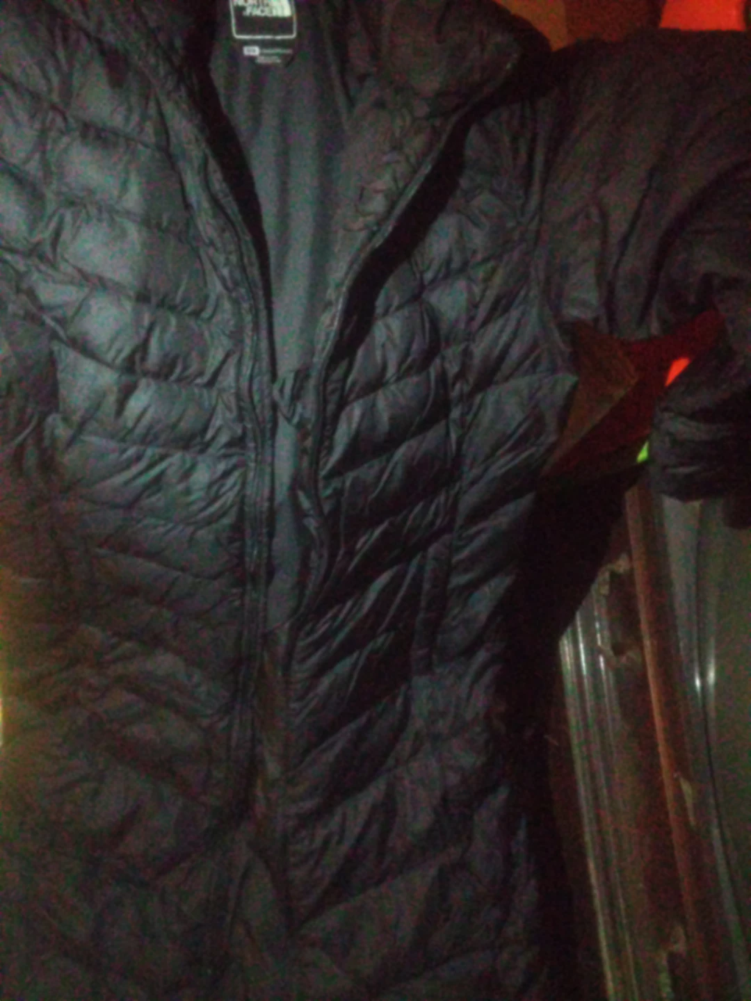 women's knee length black puffer jacket from The North Face. It's lightweight and insulated for warmth. Made for outdoor activities.