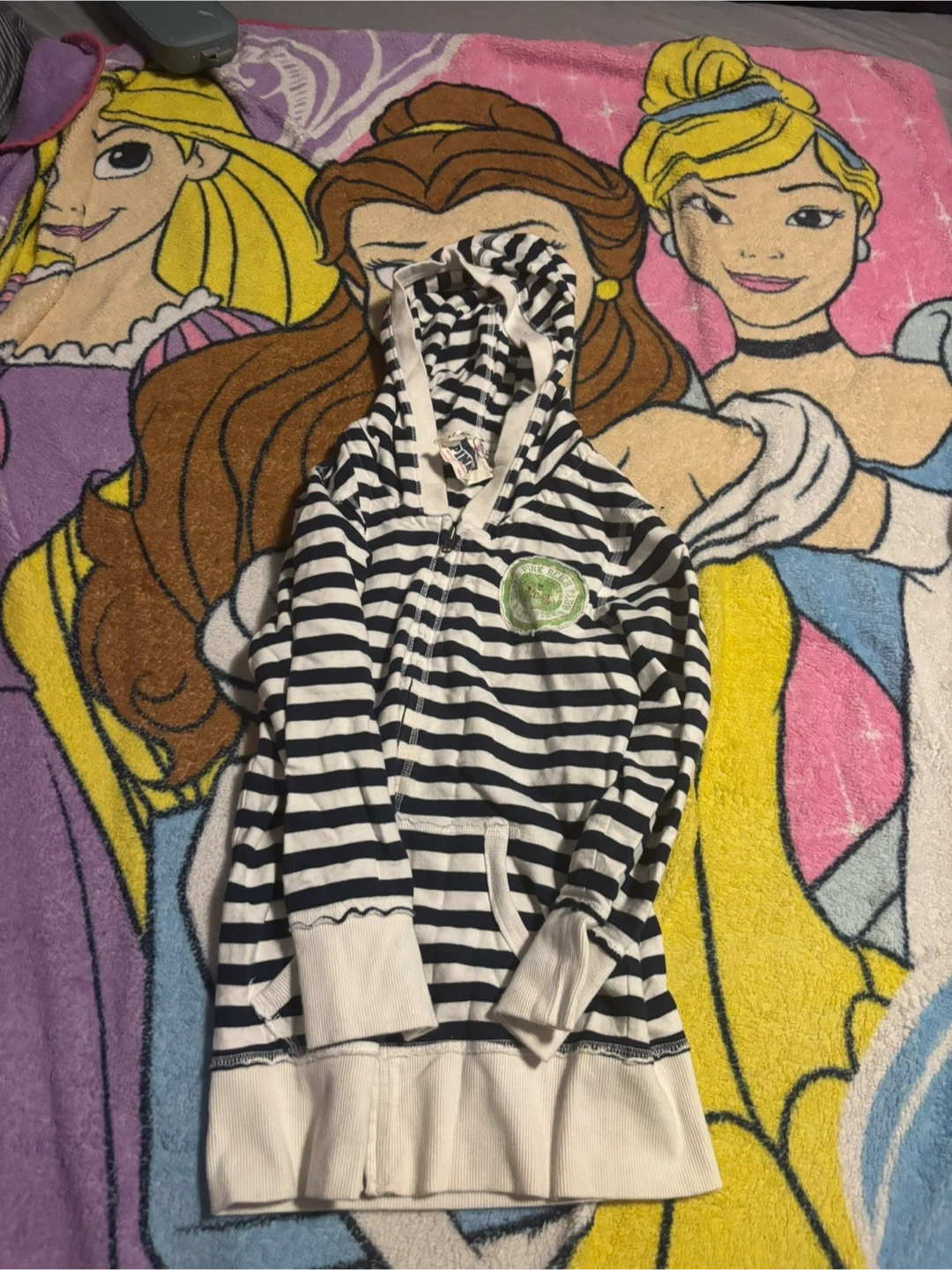 Victoria's Secret PINK French Terry zip-up hoodie with navy and white stripes. It's a comfortable, hooded jacket. Includes a patch on the chest and ribbed cuffs and hem.