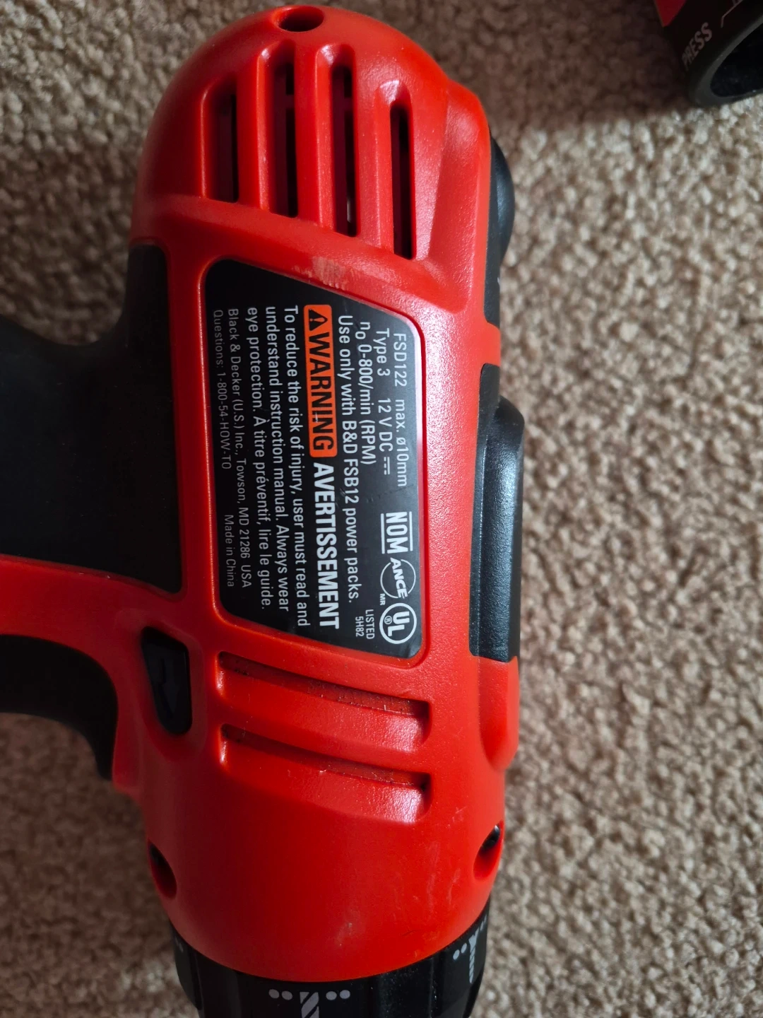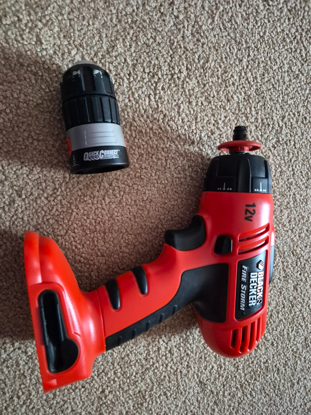 This is a Black & Decker Firestorm 12-volt cordless drill. It comes with a battery pack and charger. It has a quick connect chuck.