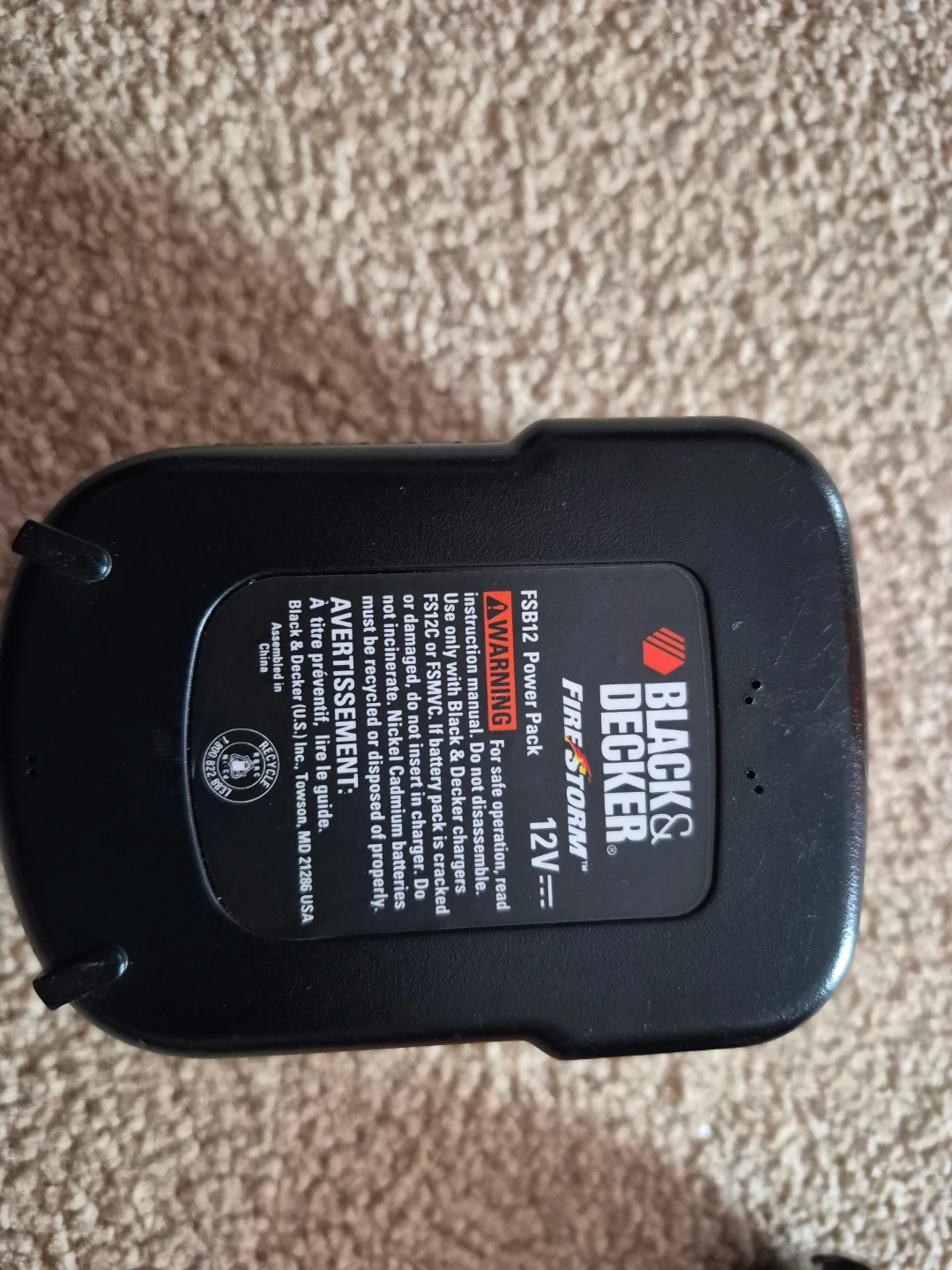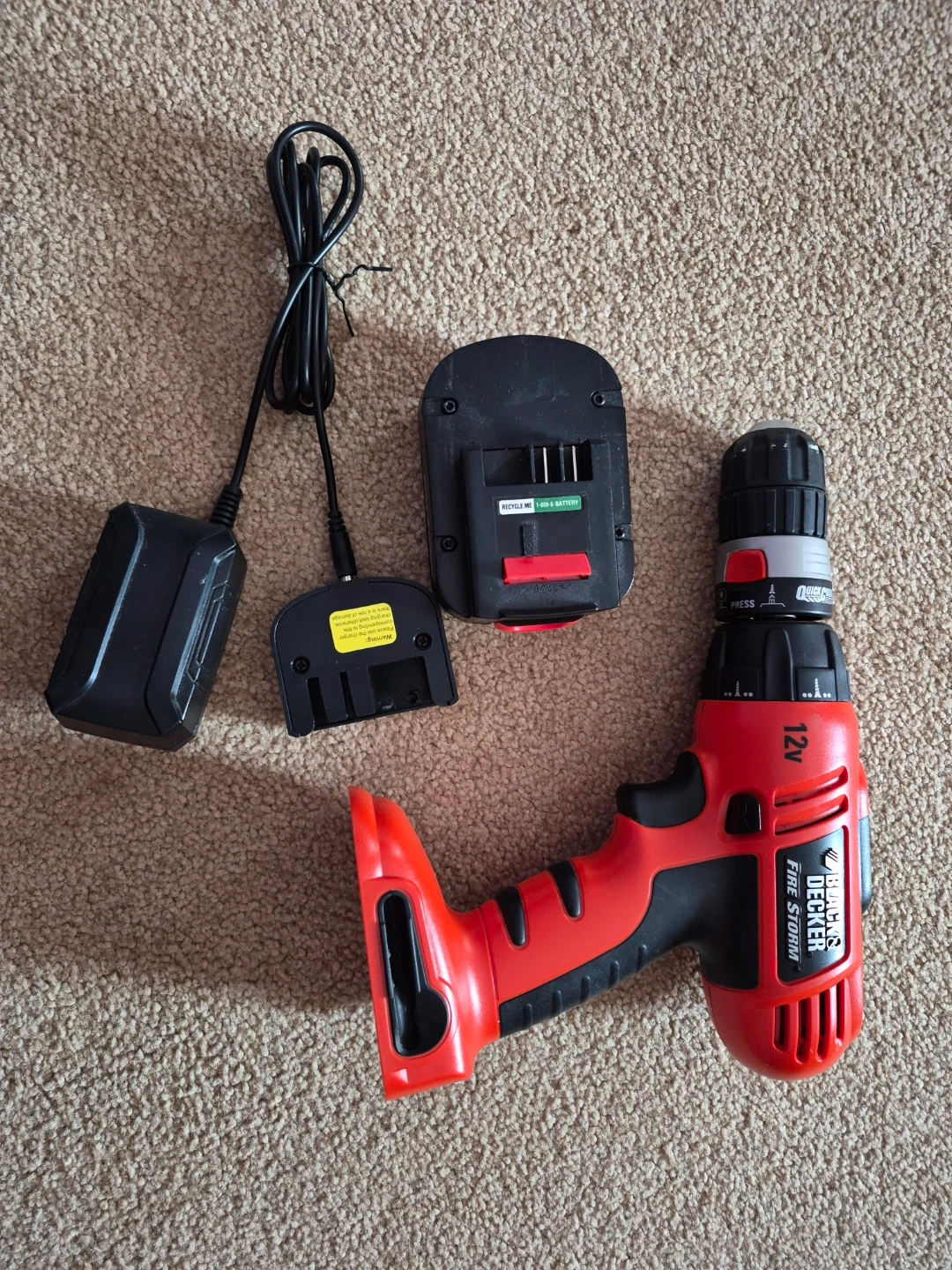 This is a Black & Decker Firestorm 12-volt cordless drill. It comes with a battery pack and charger. It has a quick connect chuck.