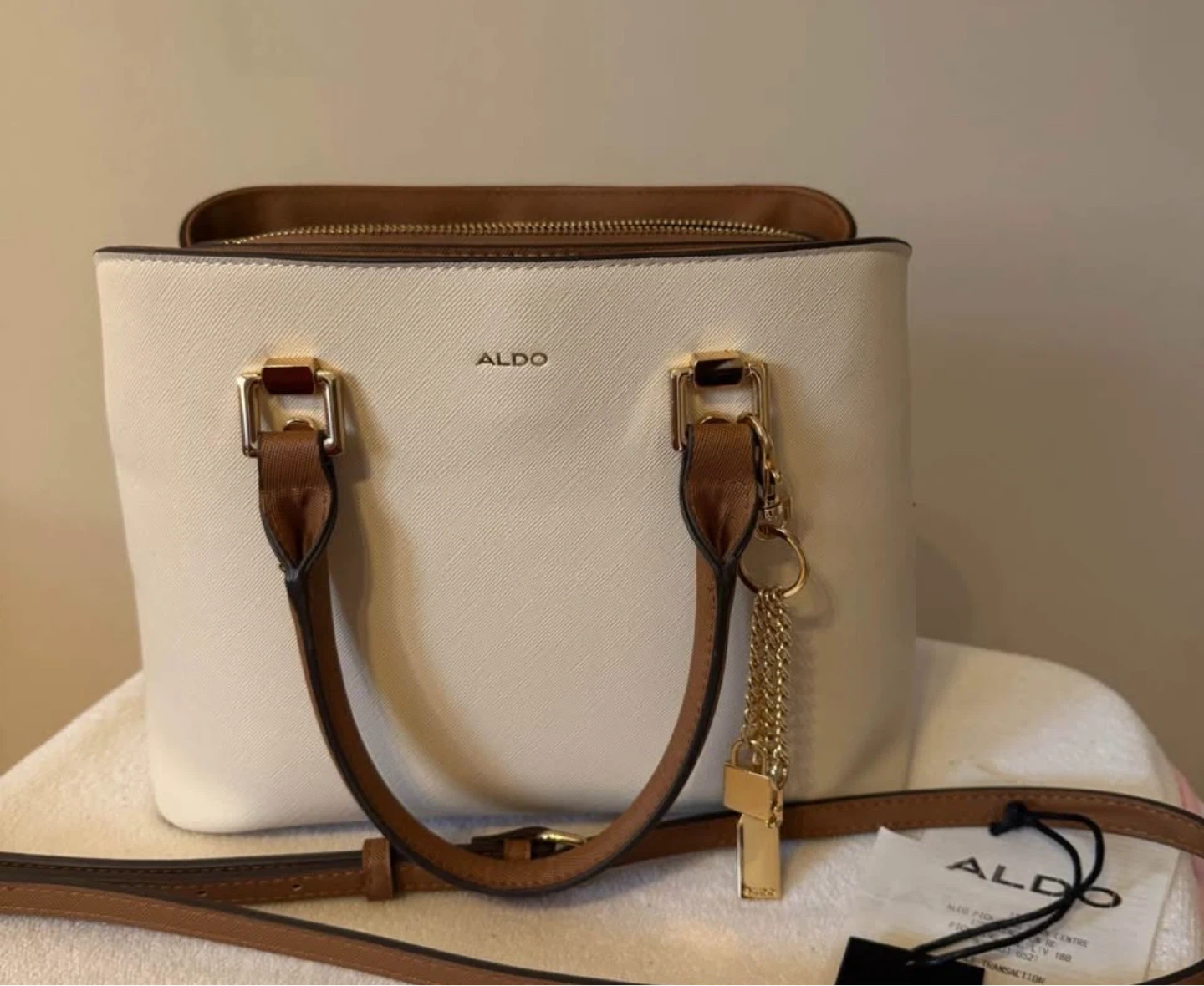 Selling a stylish Aldo handbag in white and brown! It's in great condition and perfect for everyday use or a night out. The bag features gold-tone hardware and a detachable shoulder strap