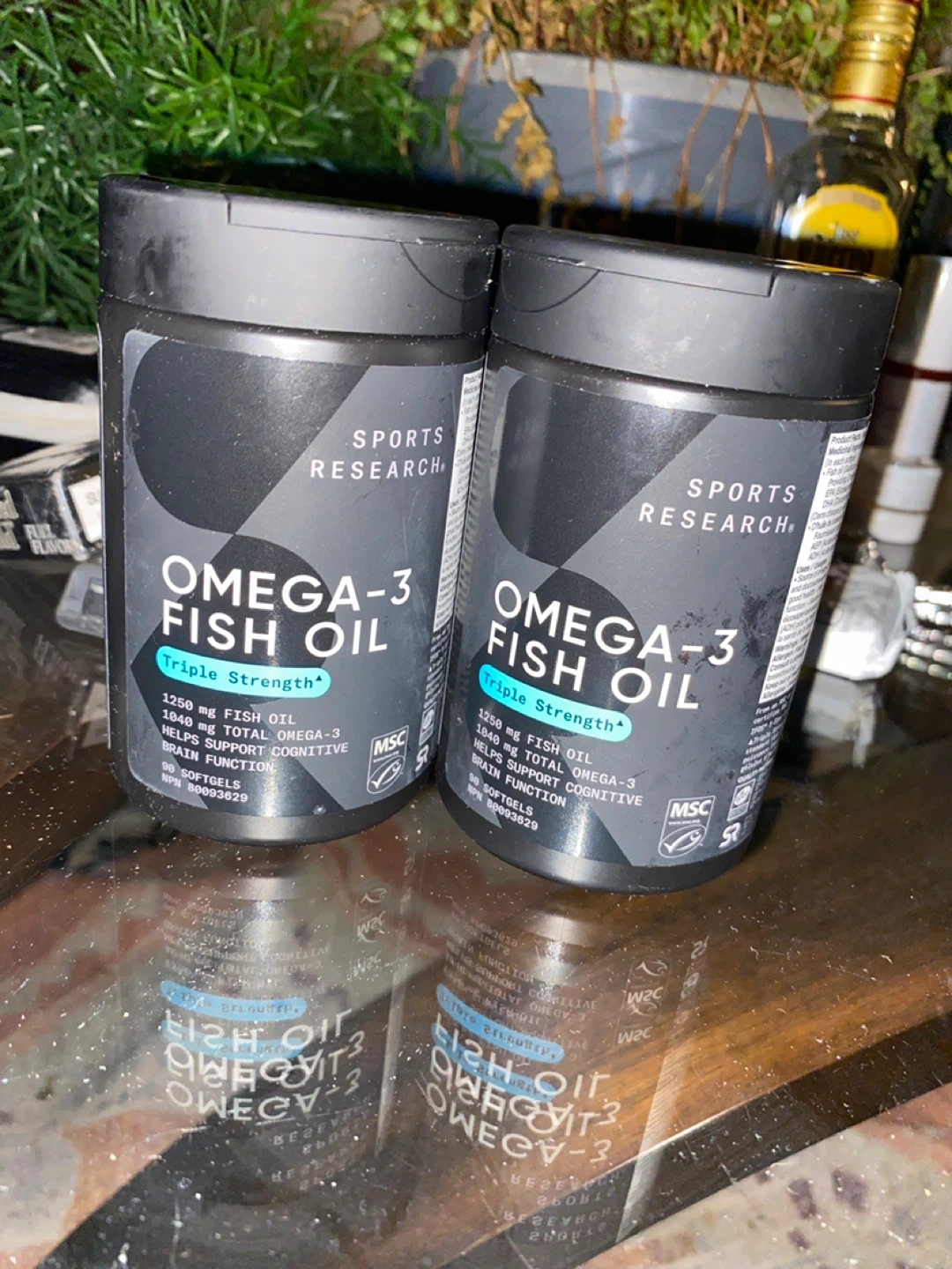 Two bottles of Sports Research Omega-3 Fish Oil. Triple Strength formula with 1250 mg fish oil and 1040 mg total Omega-3. Each bottle contains 90 softgels. Helps support cognitive brain function.