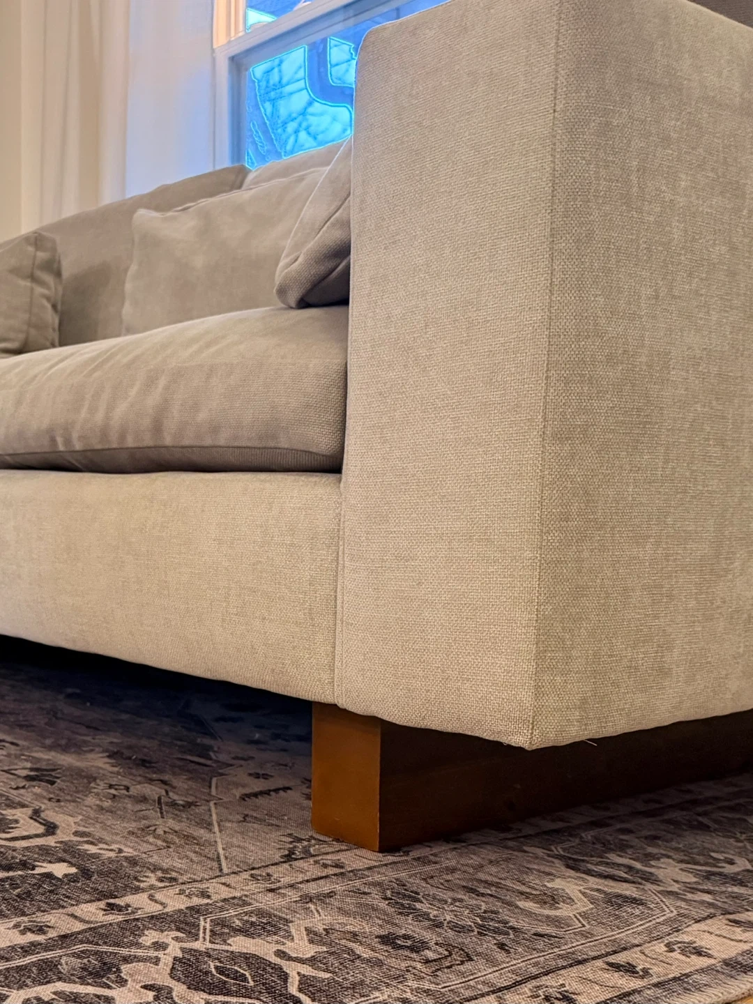 Harmony 82" Sofa, Down Blend, Distressed Velvet, Dune, Walnut legs.