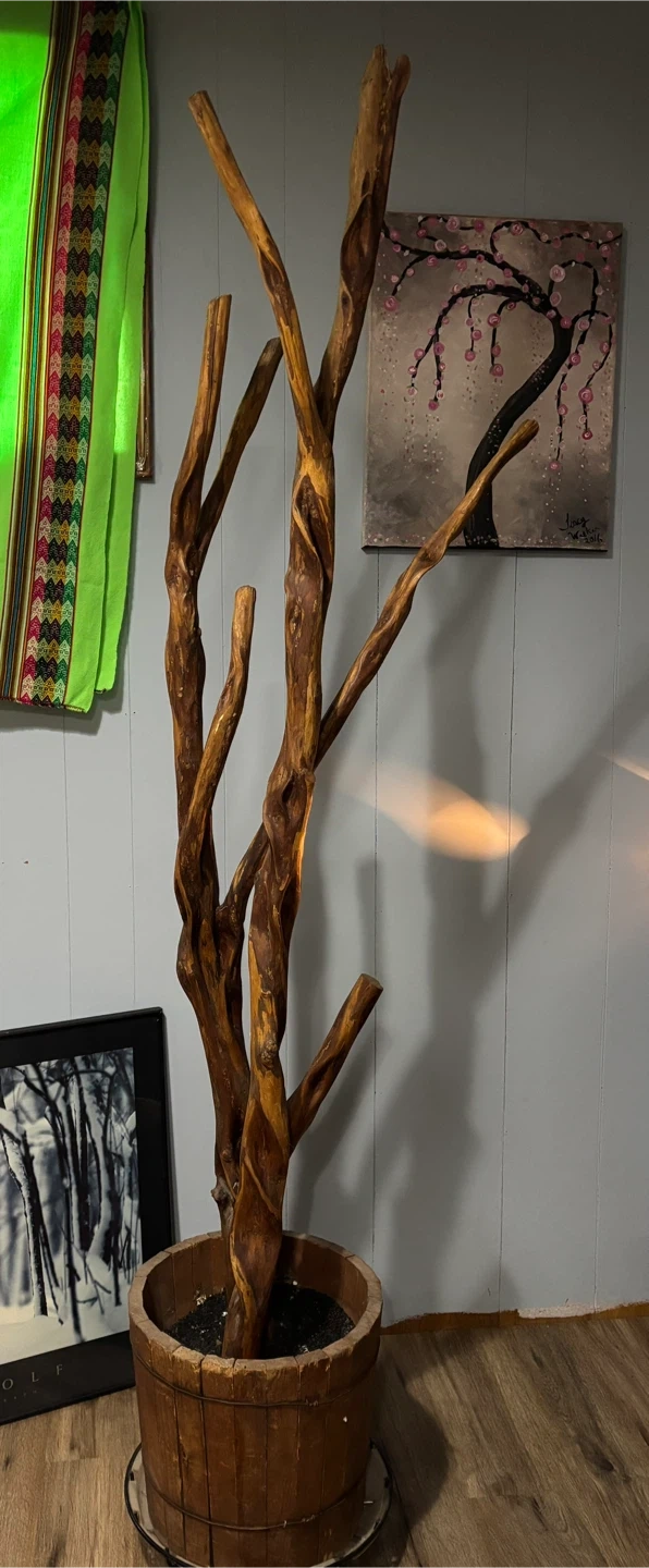 Selling a unique decorative piece! It's a natural tree branch artfully arranged in a rustic wooden planter. This would make a great addition to any home looking for a natural, earthy vibe