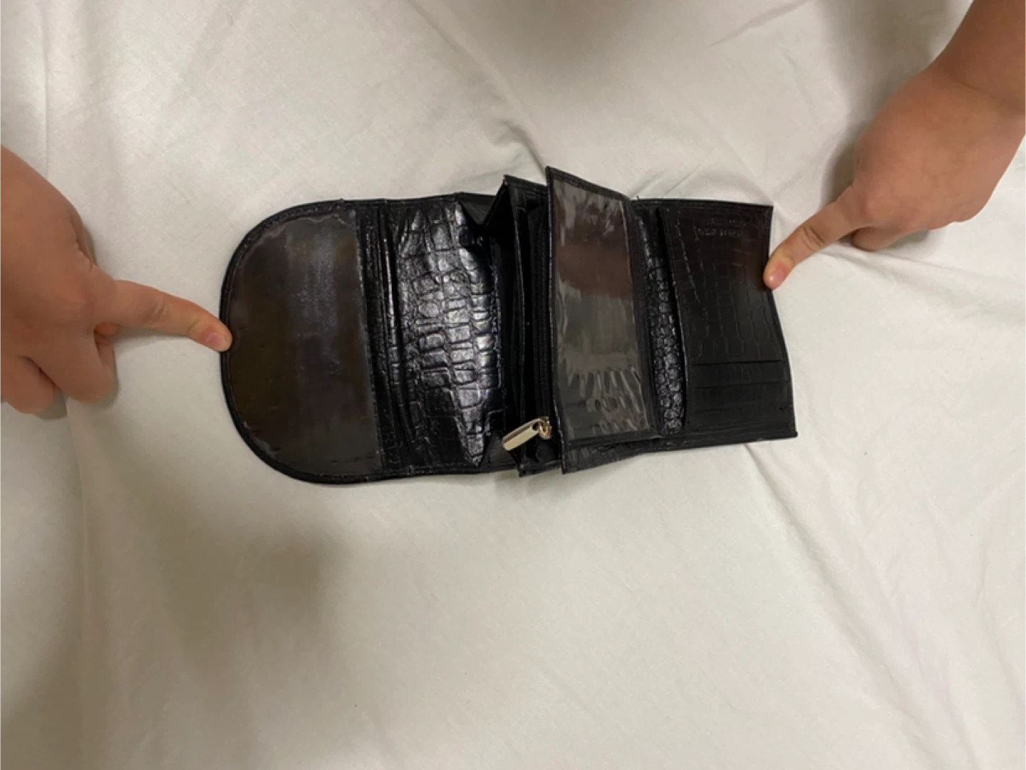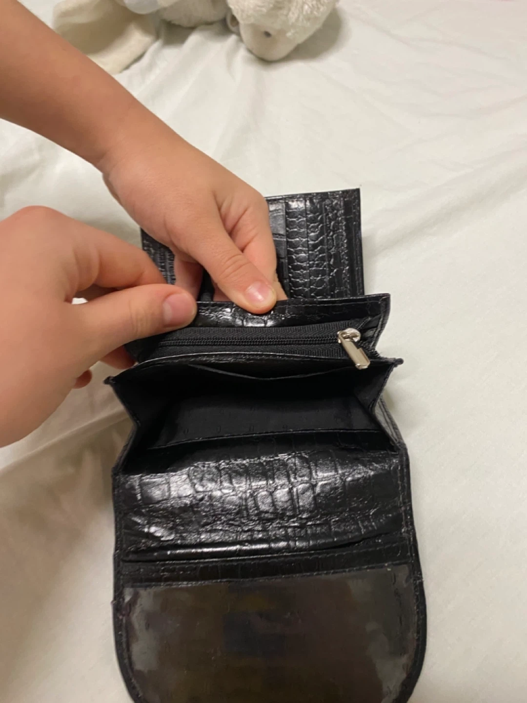 This black tri-fold wallet features a croc embossed finish. It has multiple card slots and a zippered coin pouch. It's a handy accessory for keeping your essentials organized.