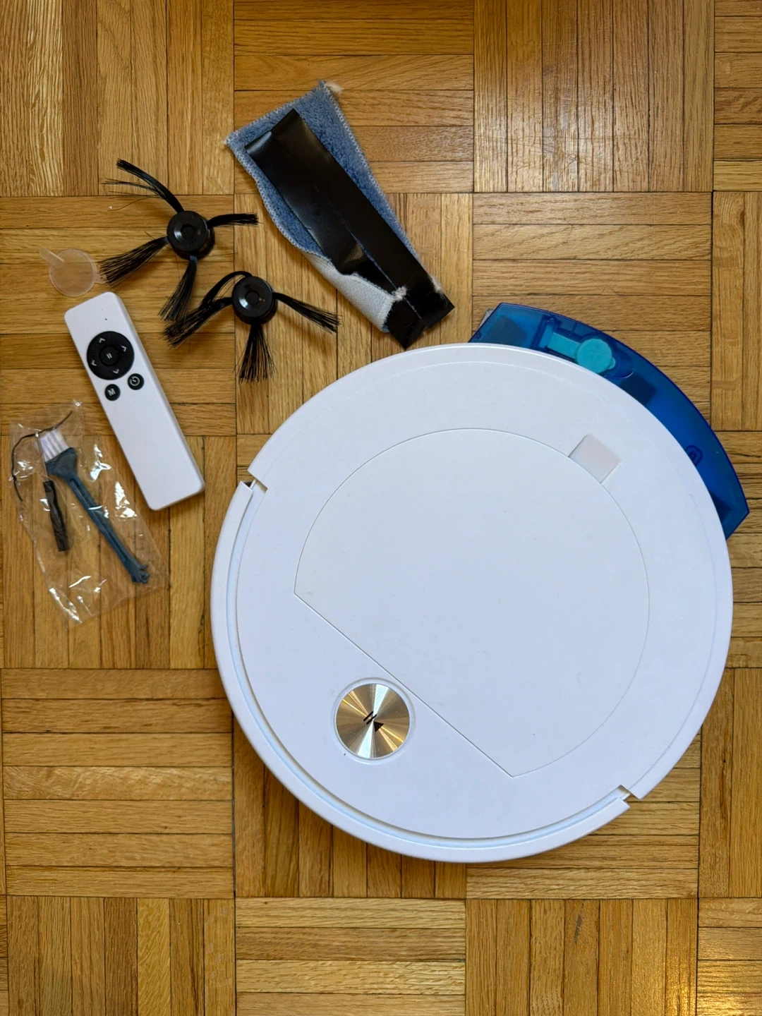 White robot vacuum cleaner. Includes a remote control, two side brushes, a cleaning brush, and a mopping pad. It's ready for cleaning! Great for hardwood floors. We used this once (it was a gift) but prefer our handheld vacuum. We have not used this in over a year, so it likely needs new batteries and someone who knows how to use this, as we are not very familiar with this type of technology.