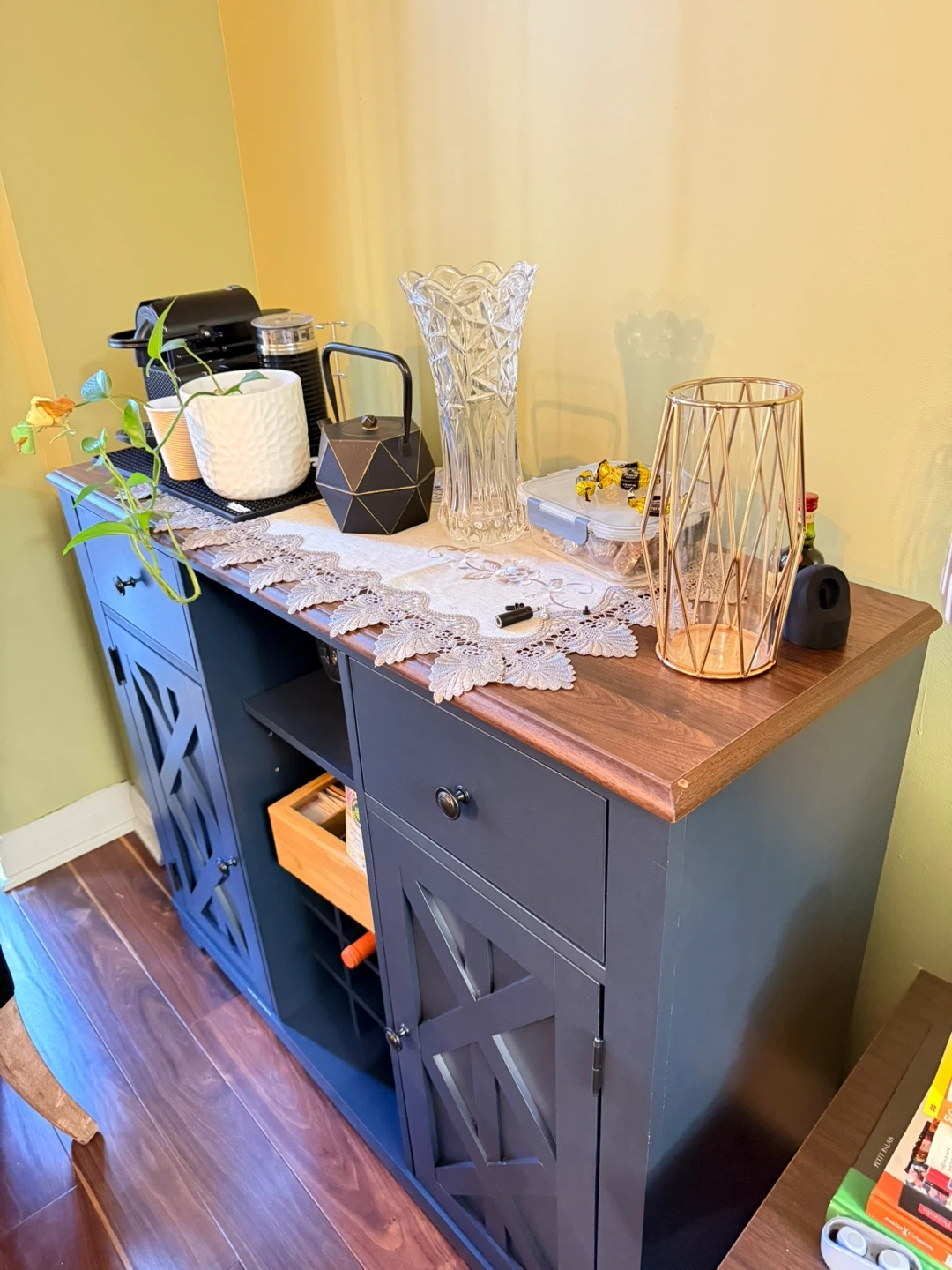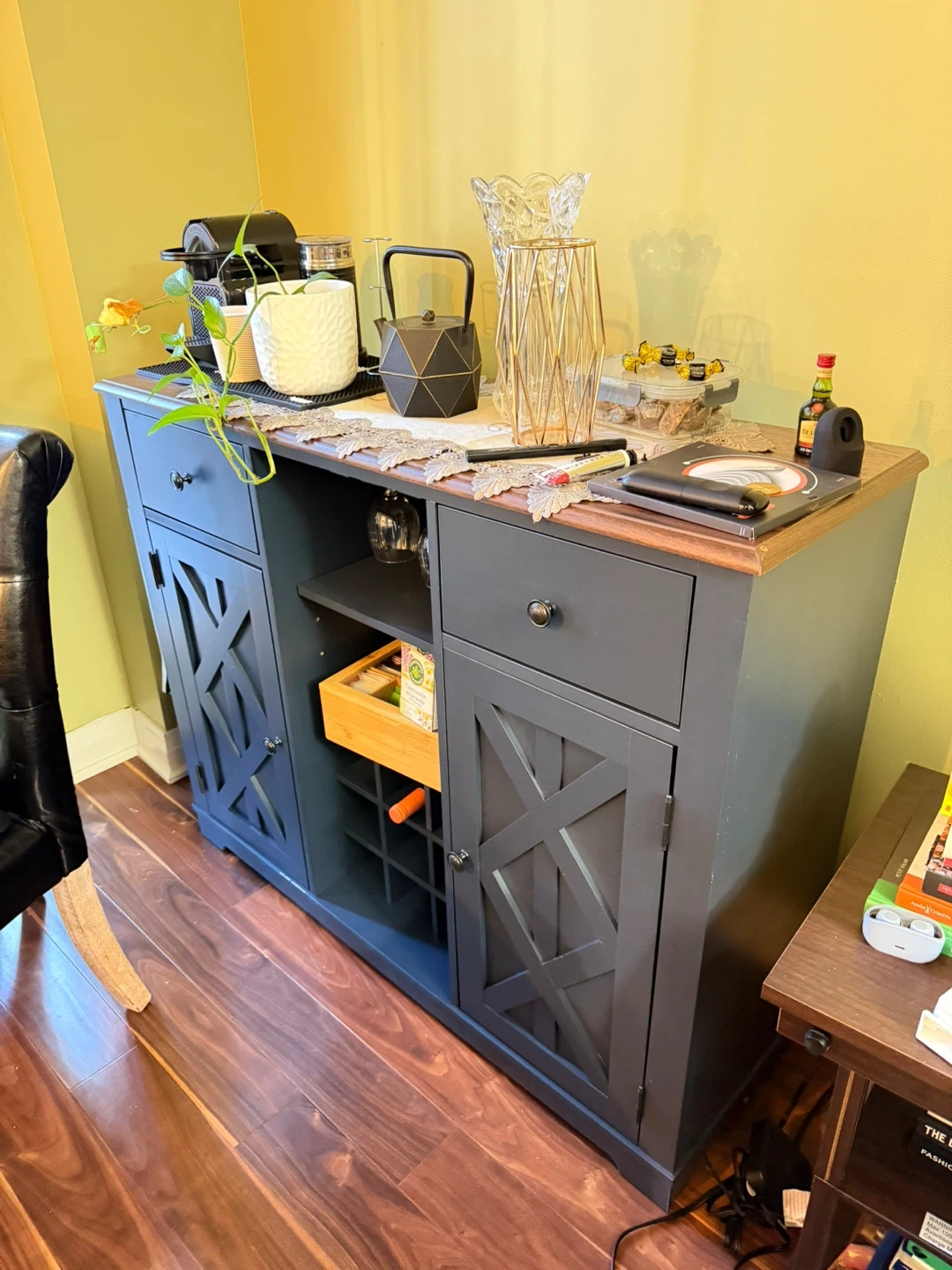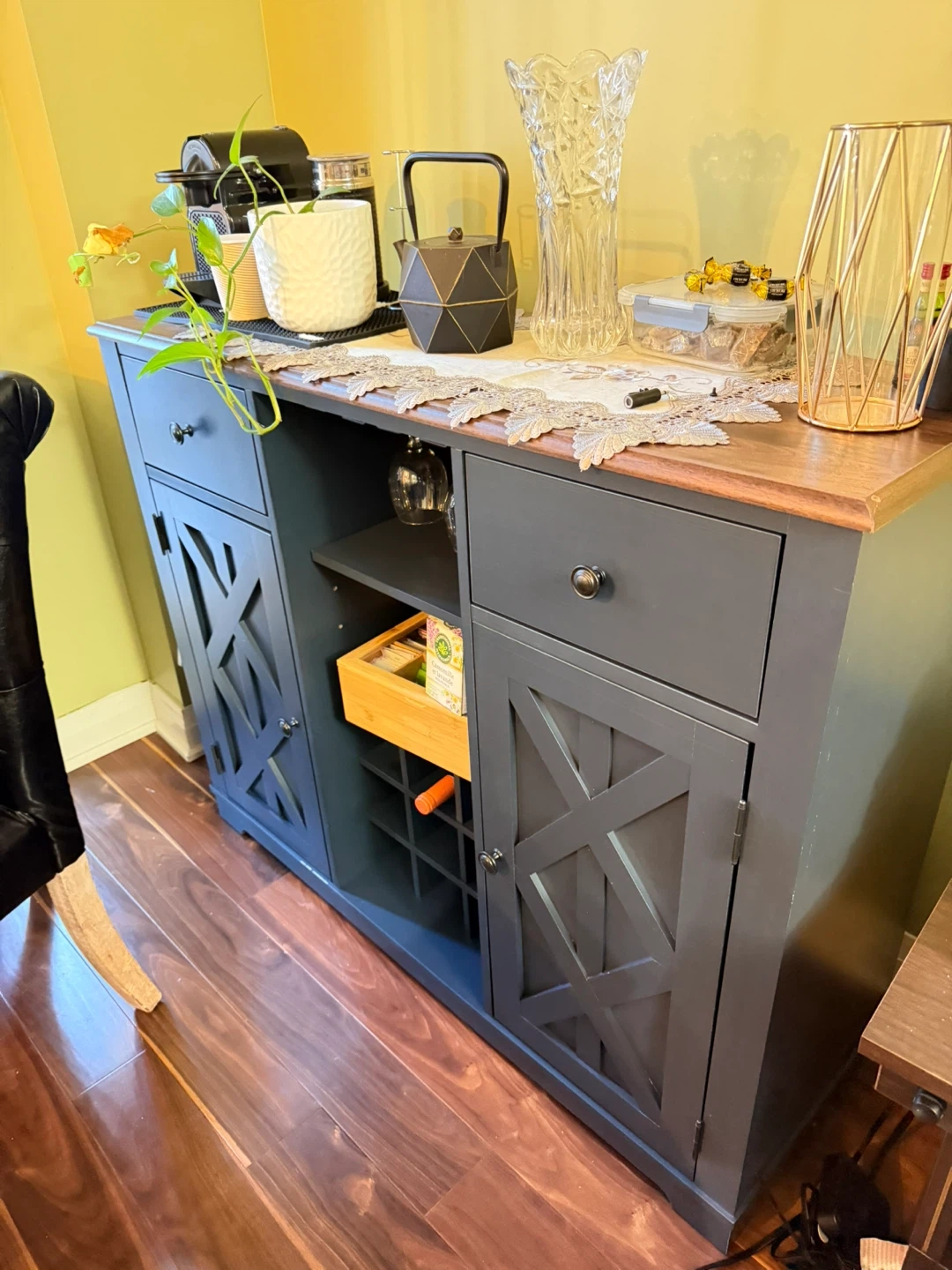 This navy wood bar features a lovely wooden top, perfect for a dining room or kitchen. It includes two cabinets with decorative X-pattern doors and two drawers for storage. There's also an open shelf with a wine rack below it. It's a stylish piece that offers plenty of organization!