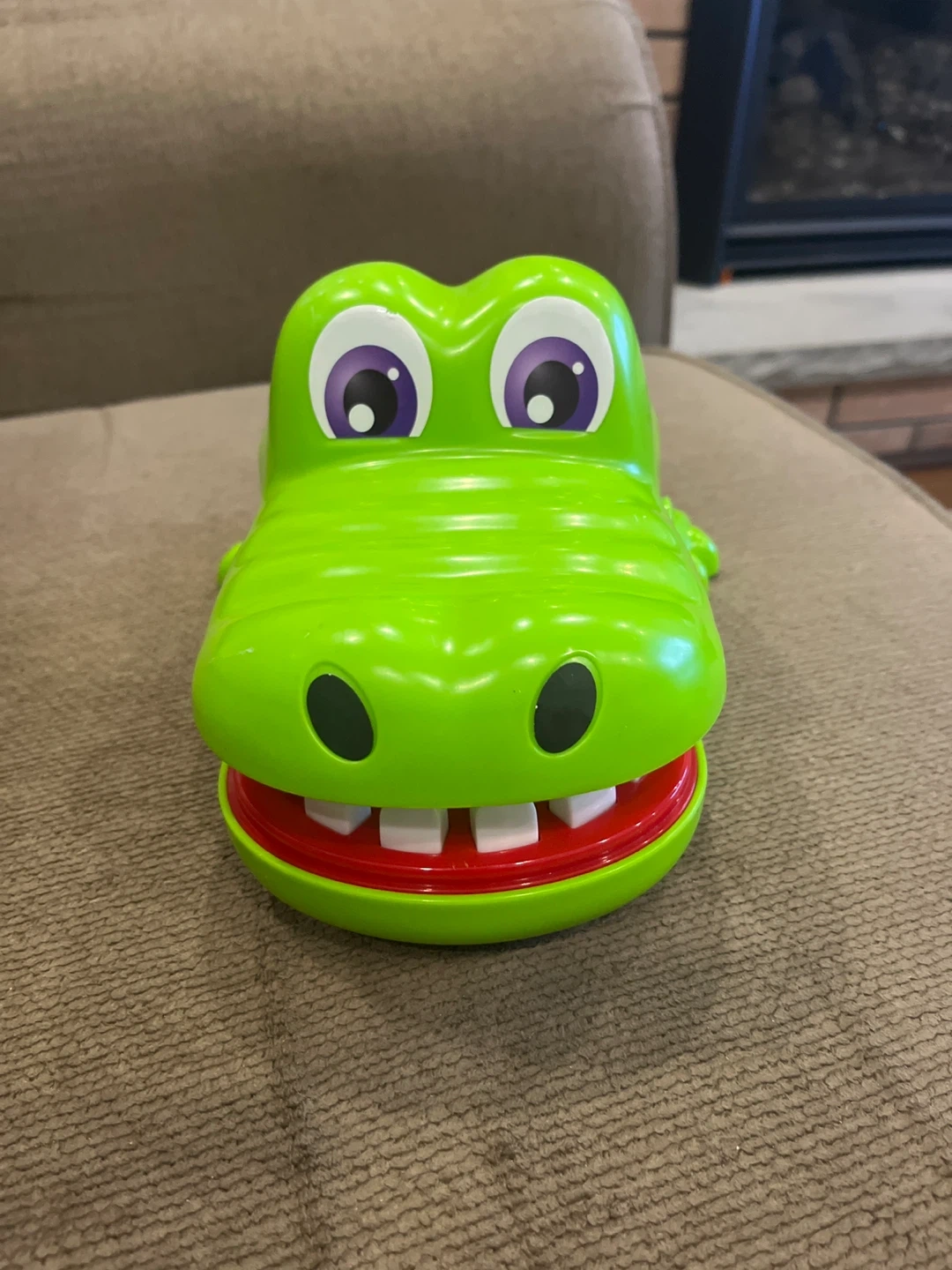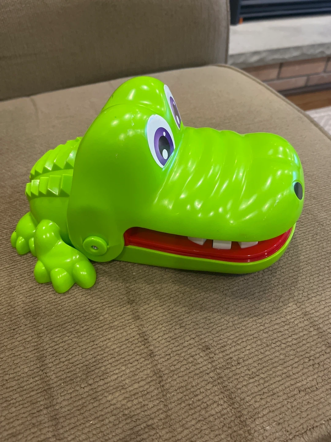 It's a fun crocodile gag toy with a spring-loaded jaw and big, colourful eyes. Made of durable plastic, it's ready for playtime! This toy is great for quick laughs and playful surprises.