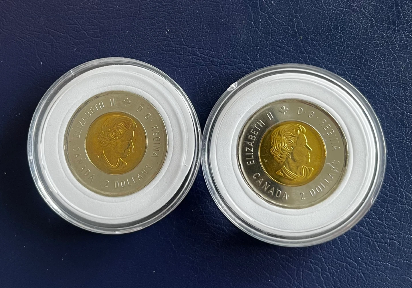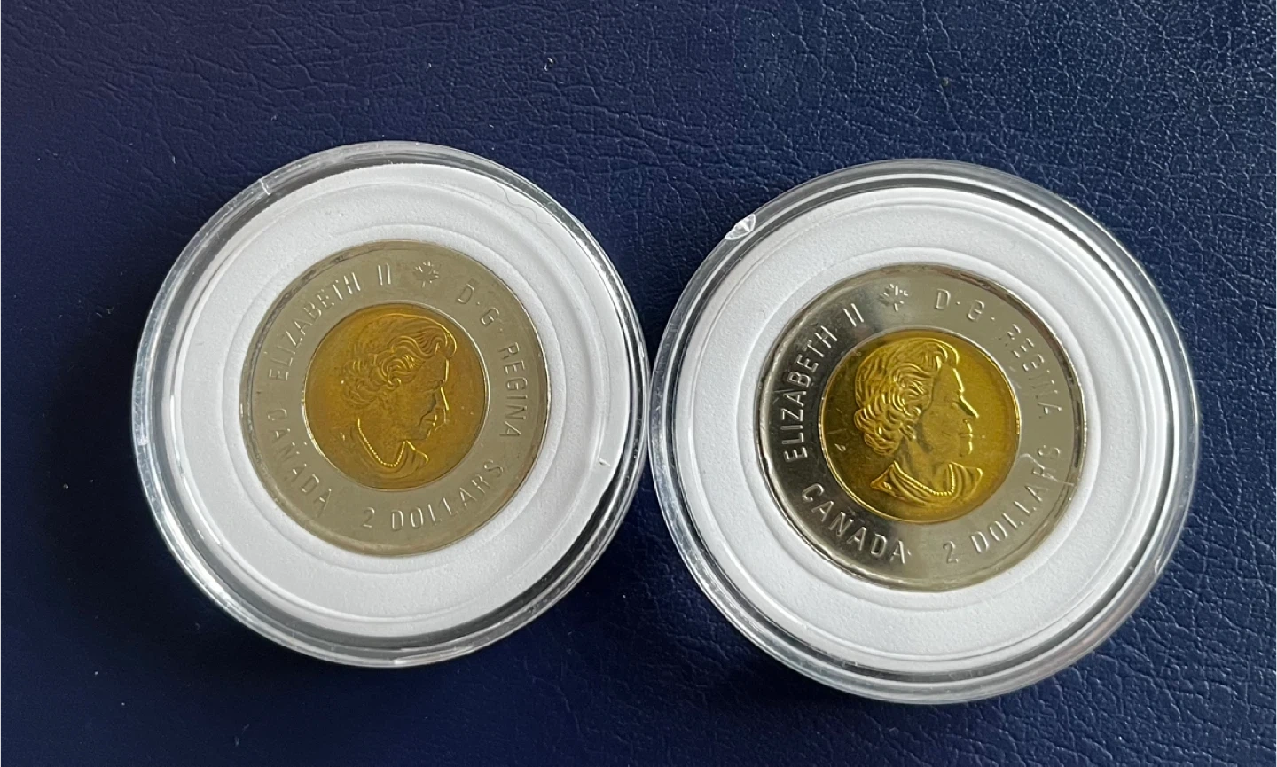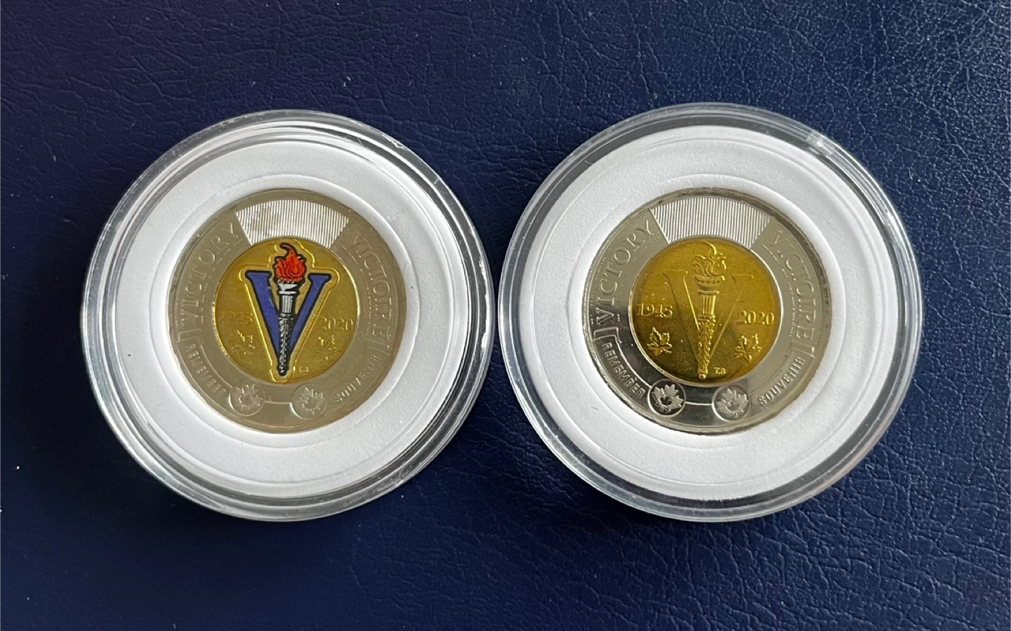 15 dollars each both 25 dollars Two Canadian $2 coins commemorating Victory in 2020. Each coin features the effigy of Queen Elizabeth II on the reverse and a V for Victory symbol with a torch on the obverse. These are collector coins in protective casings.